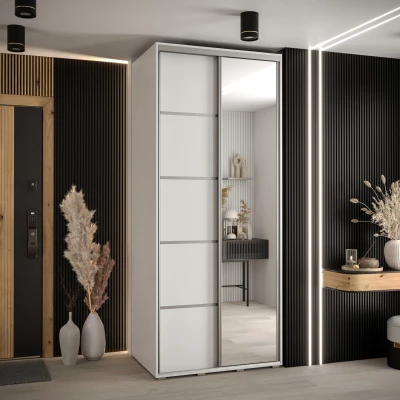 Úzká šatní skříň se zrcadlem ASIRI zaujme svým moderním designem a praktickými prvky. Skříň má posuvné dveře, které se neotvírají do prostoru a ušetří tak spoustu místa. Vnitřek skříně lze uspořádat dle vašich potřeb.