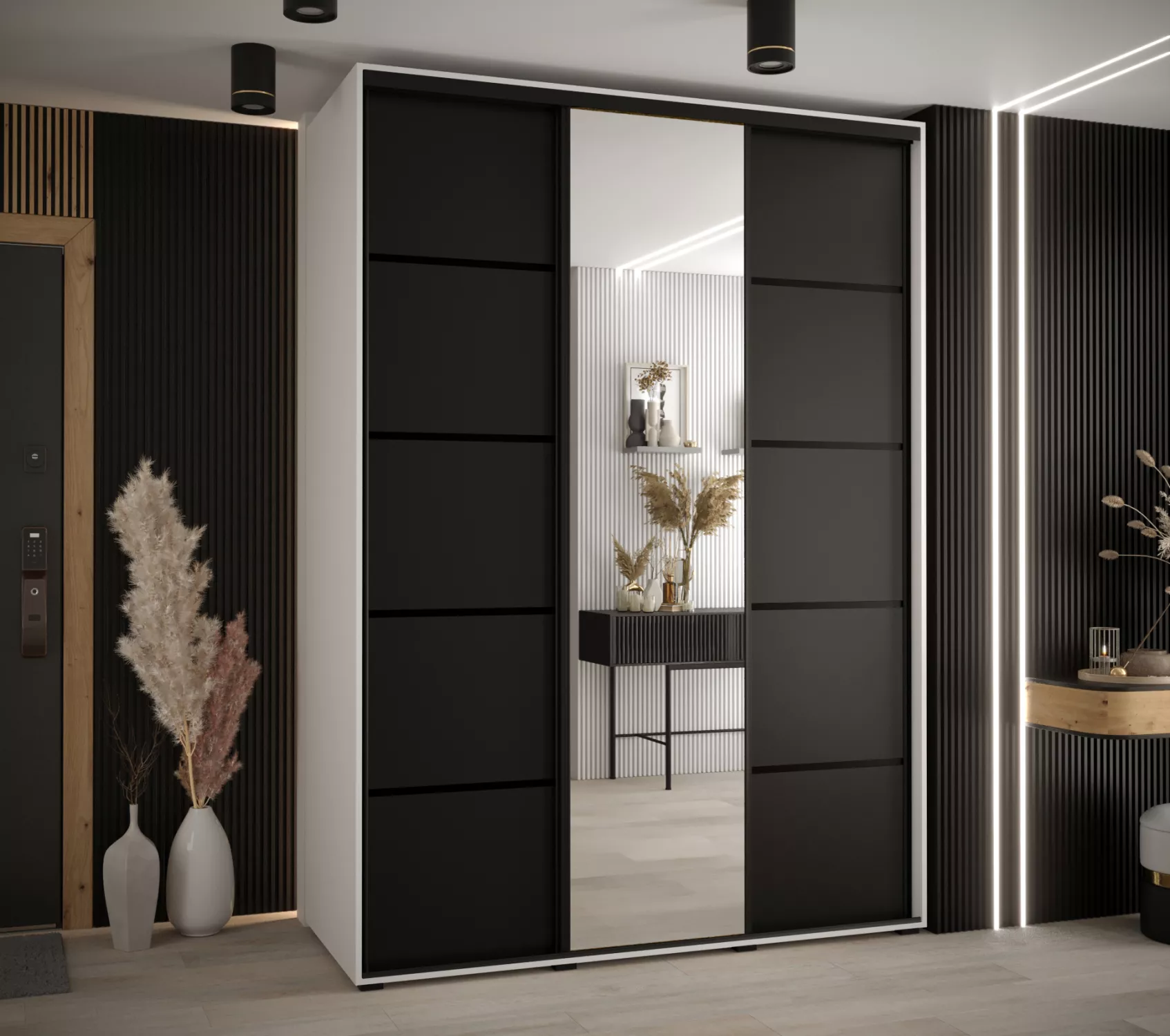 Velká šatní skříň se zrcadlem ASIRI zaujme svým moderním designem a praktickými prvky. Skříň má posuvné dveře, které se neotvírají do prostoru a ušetří tak spoustu místa. Vnitřek skříně lze uspořádat dle vašich potřeb.