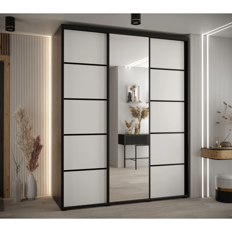 Velká šatní skříň se zrcadlem ASIRI zaujme svým moderním designem a praktickými prvky. Skříň má posuvné dveře, které se neotvírají do prostoru a ušetří tak spoustu místa. Vnitřek skříně lze uspořádat dle vašich potřeb.