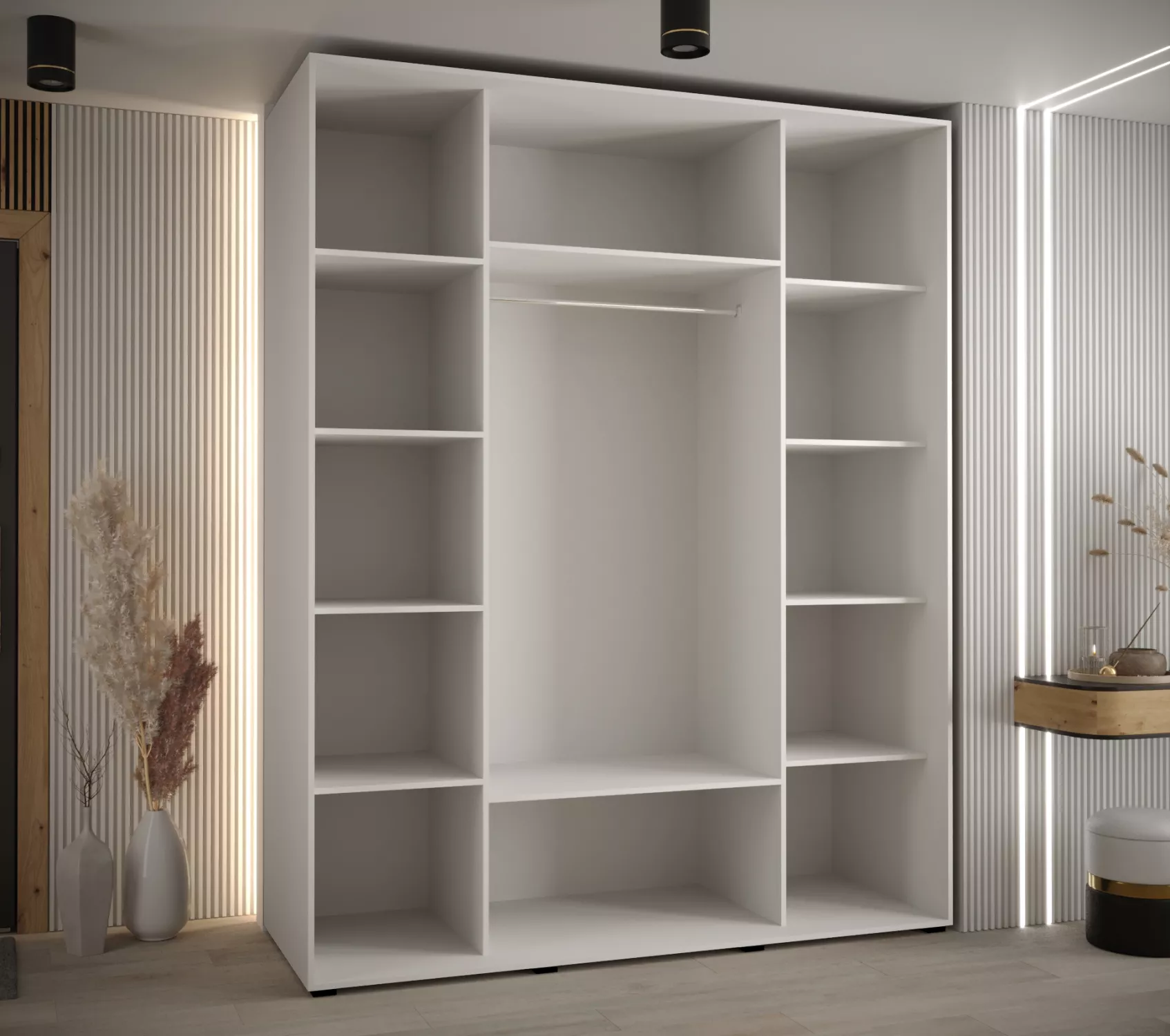 Šatní skříň ASIRI zaujme svým moderním designem a praktickými prvky. Šatní skříň má posuvné dveře, které se neotvírají do prostoru a ušetří tak spoustu místa.