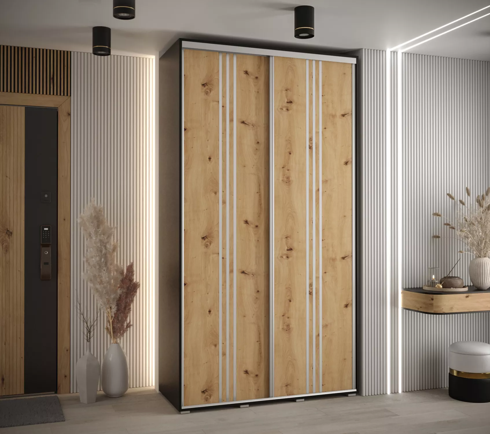 Šatní skříň ASIRI zaujme svým moderním designem a praktickými prvky. Skříň má posuvné dveře, které se neotvírají do prostoru a ušetří tak spoustu místa. Vnitřek skříně lze uspořádat dle vašich potřeb.
