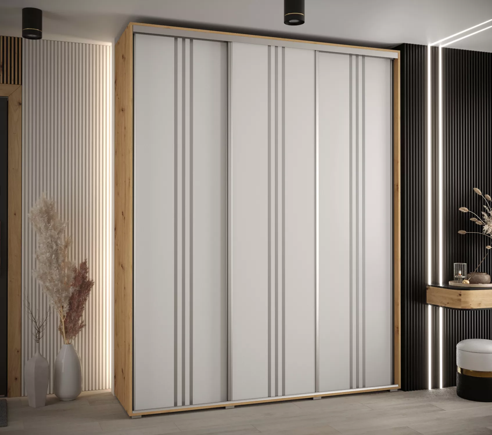 Velká šatní skříň ASIRI zaujme svým moderním designem a praktickými prvky. Skříň má posuvné dveře, které se neotvírají do prostoru a ušetří tak spoustu místa. Vnitřek skříně lze uspořádat dle vašich potřeb.