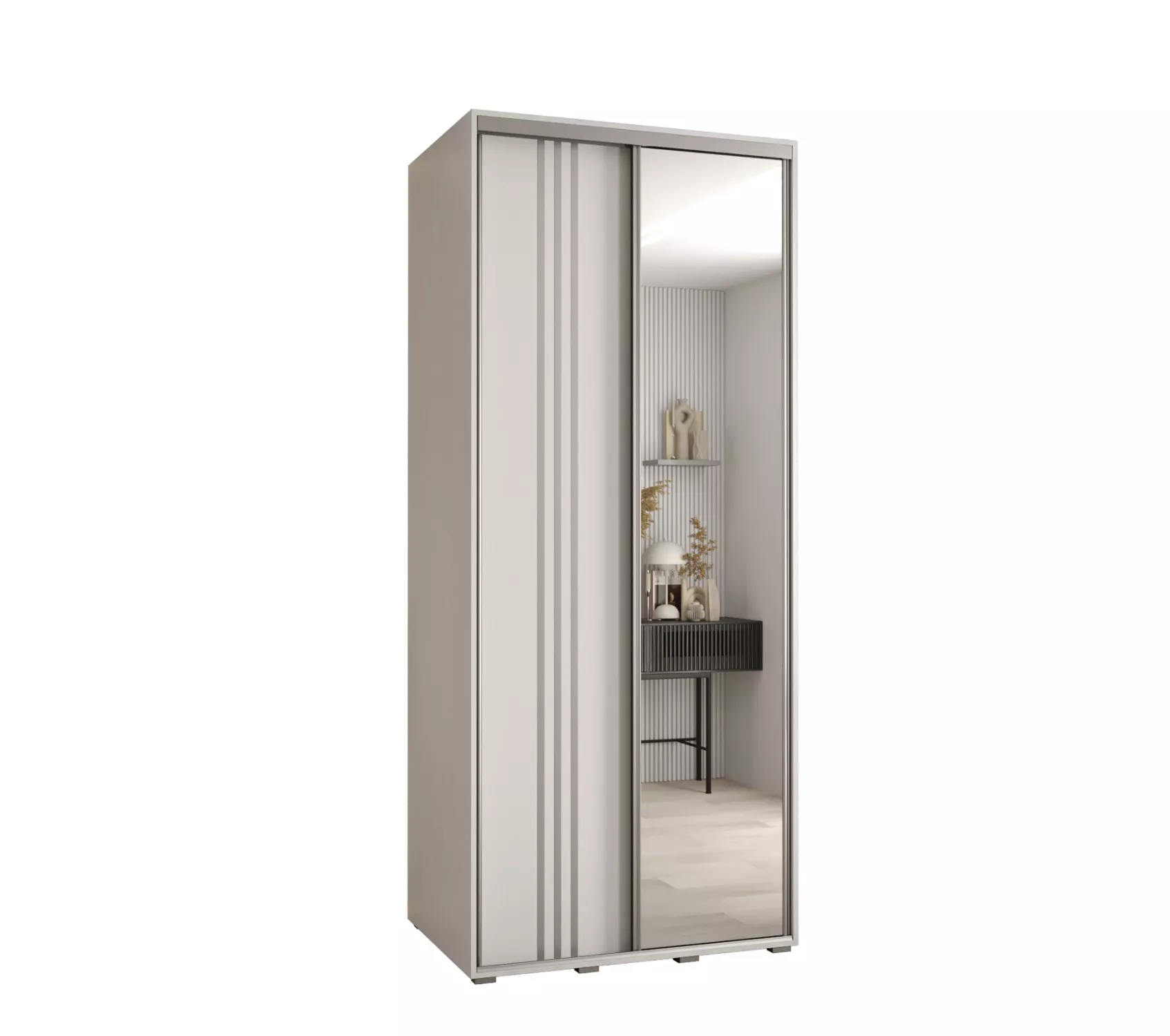 Úzká šatní skříň se zrcadlem ASIRI zaujme svým moderním designem a praktickými prvky. Skříň má posuvné dveře, které se neotvírají do prostoru a ušetří tak spoustu místa.