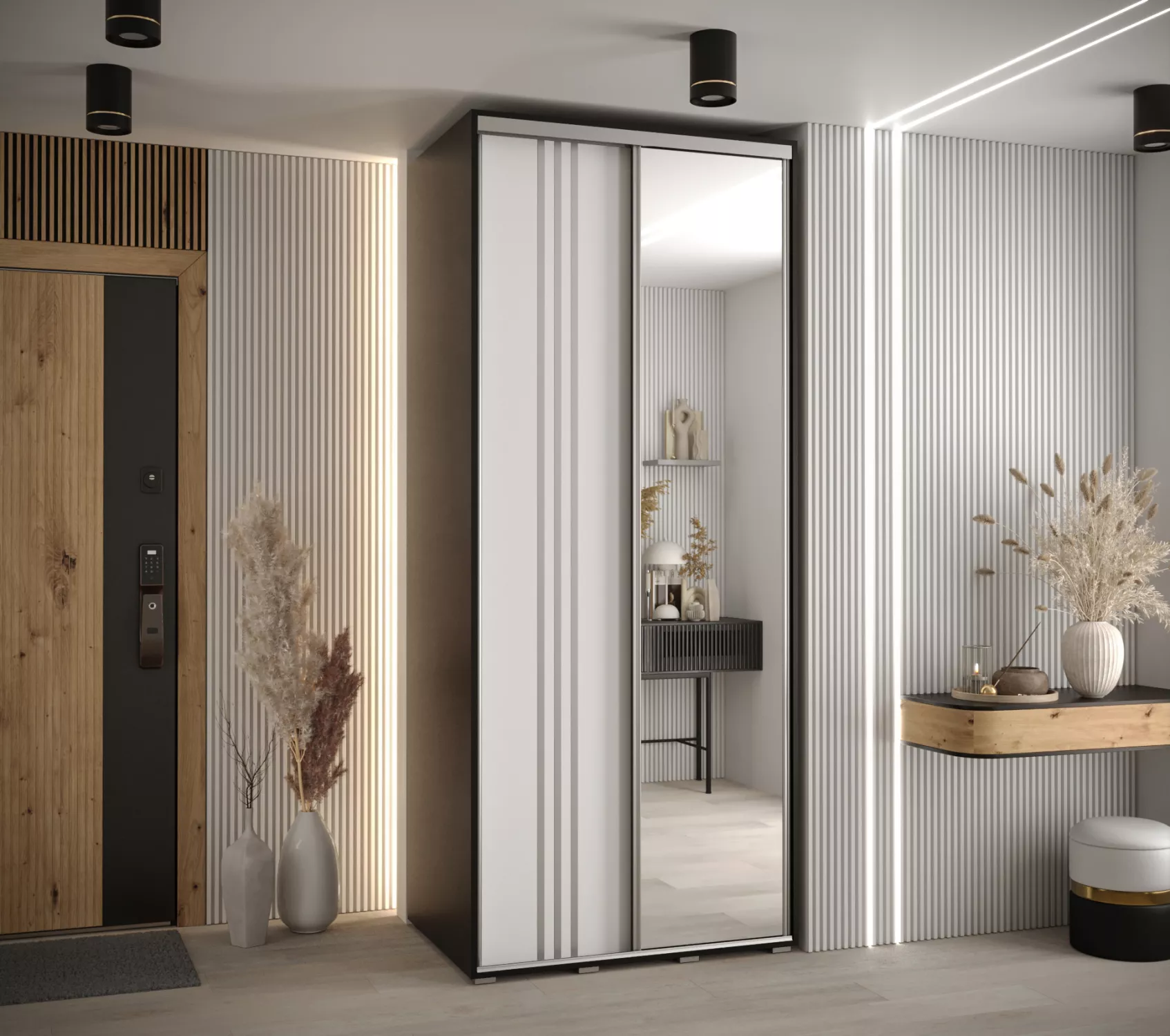 Úzká šatní skříň se zrcadlem ASIRI zaujme svým moderním designem a praktickými prvky. Skříň má posuvné dveře, které se neotvírají do prostoru a ušetří tak spoustu místa.