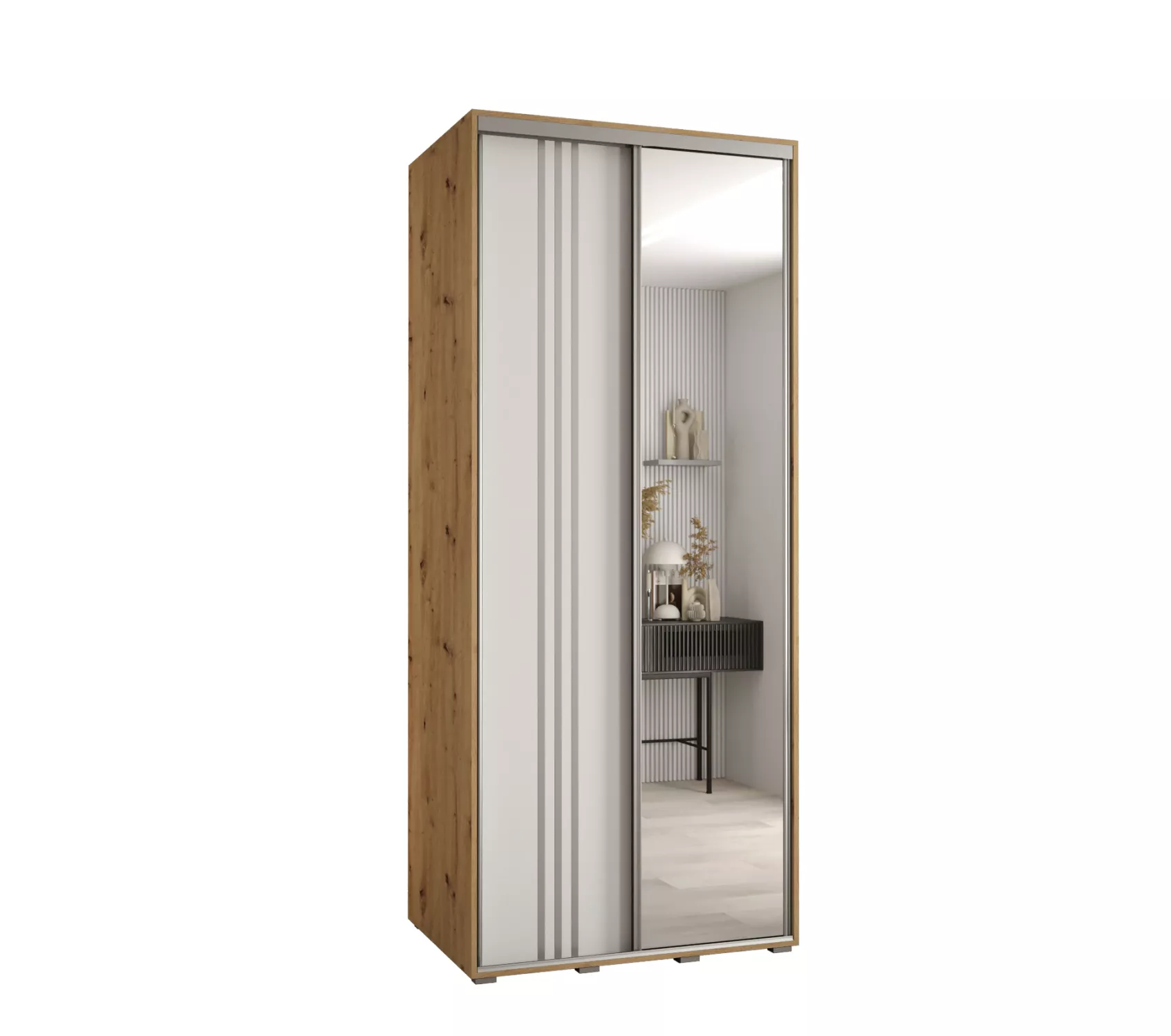 Úzká šatní skříň se zrcadlem ASIRI zaujme svým moderním designem a praktickými prvky. Skříň má posuvné dveře, které se neotvírají do prostoru a ušetří tak spoustu místa.