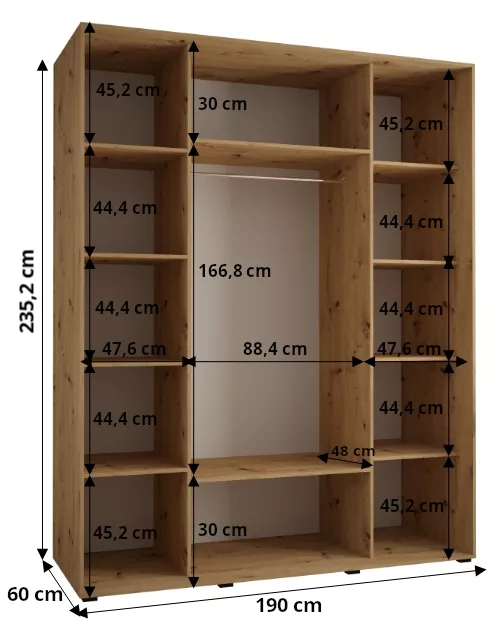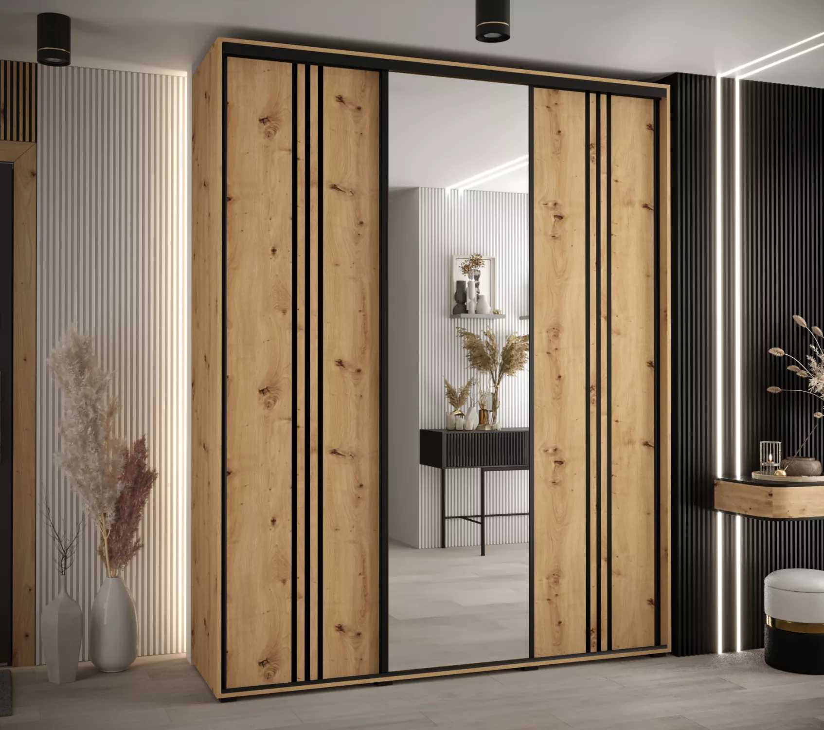 Velká šatní skříň se zrcadlem ASIRI zaujme svým moderním designem a praktickými prvky. Skříň má posuvné dveře, které se neotvírají do prostoru a ušetří tak spoustu místa. Vnitřek skříně lze uspořádat dle vašich potřeb.