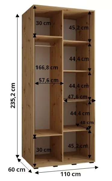 Úzká šatní skříň ASIRI zaujme svým moderním designem a praktickými prvky. Skříň má posuvné dveře, které se neotvírají do prostoru a ušetří tak spoustu místa.