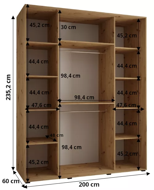 Šatní skříň ASIRI zaujme svým moderním designem a praktickými prvky. Šatní skříň má posuvné dveře, které se neotvírají do prostoru a ušetří tak spoustu místa.