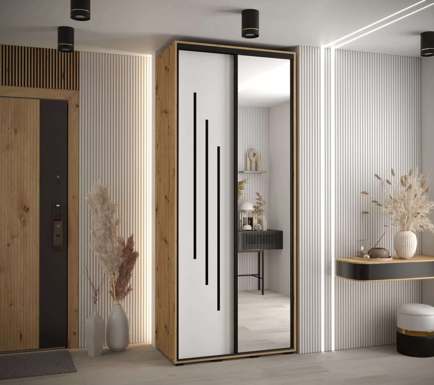 Úzká šatní skříň se zrcadlem ASIRI zaujme svým moderním designem a praktickými prvky. Skříň má posuvné dveře, které se neotvírají do prostoru a ušetří tak spoustu místa. Vnitřek skříně lze uspořádat dle vašich potřeb.