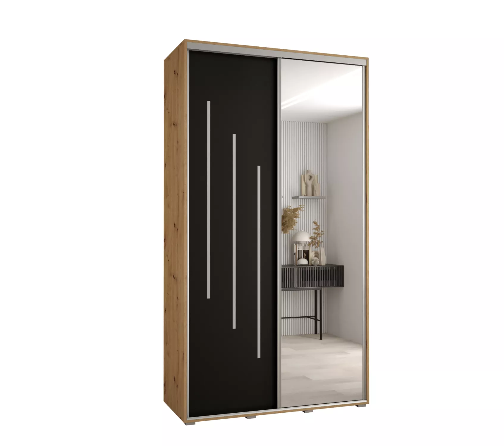 Šatní skříň se zrcadlem ASIRI zaujme svým moderním designem a praktickými prvky. Skříň má posuvné dveře, které se neotvírají do prostoru a ušetří tak spoustu místa. Vnitřek skříně lze uspořádat dle vašich potřeb.