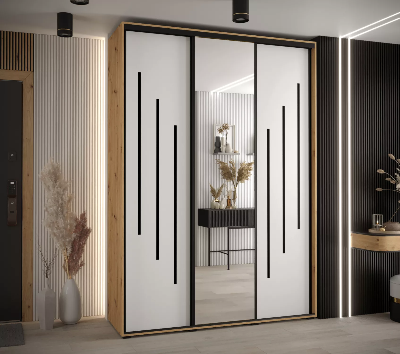 Vysoká šatní skříň se zrcadlem ASIRI zaujme svým moderním designem a praktickými prvky. Skříň má posuvné dveře, které se neotvírají do prostoru a ušetří tak spoustu místa. Vnitřek skříně lze uspořádat dle vašich potřeb.