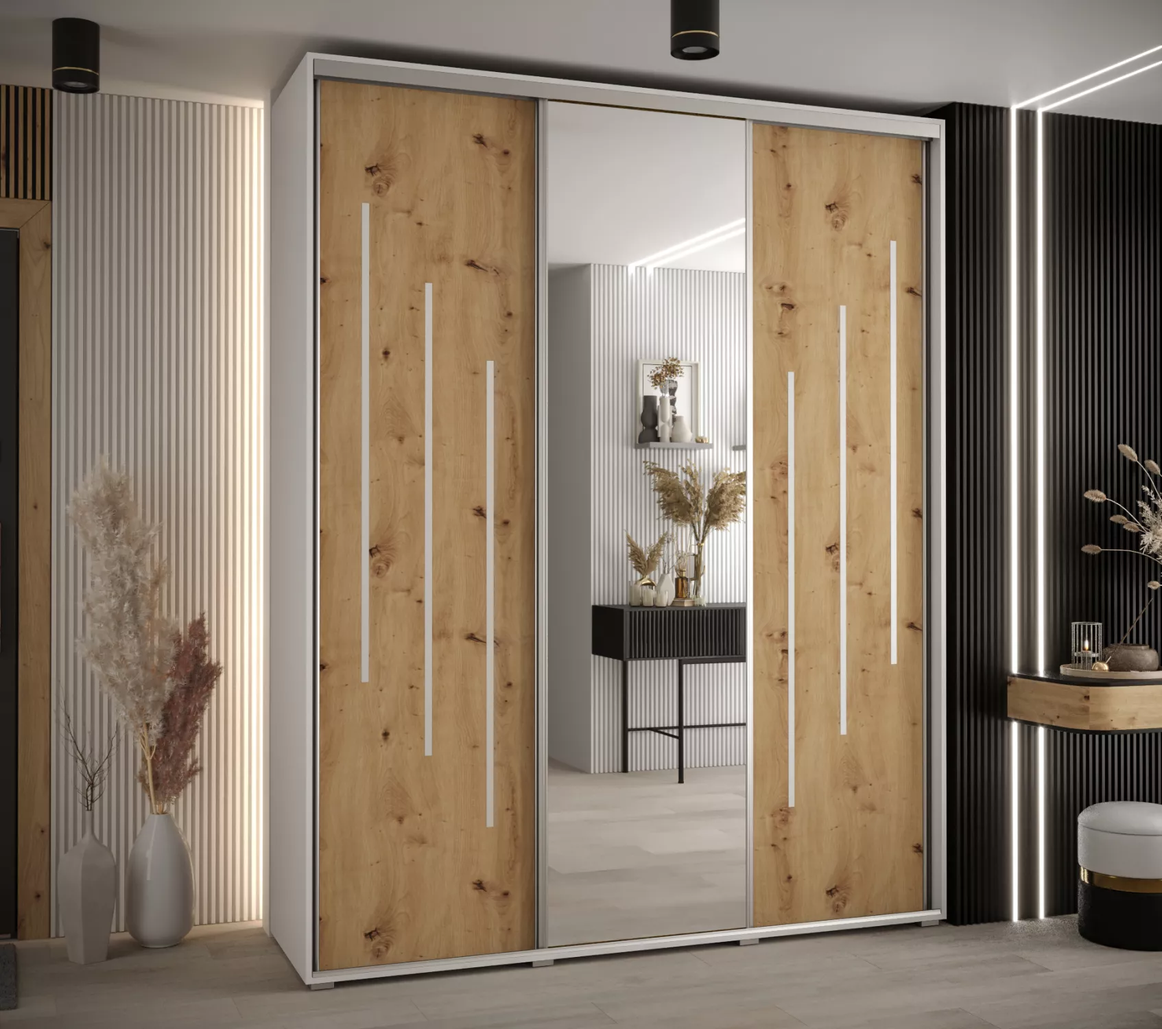 Šatní skříň ASIRI zaujme svým moderním designem a praktickými prvky. Šatní skříň má posuvné dveře, které se neotvírají do prostoru a ušetří tak spoustu místa.