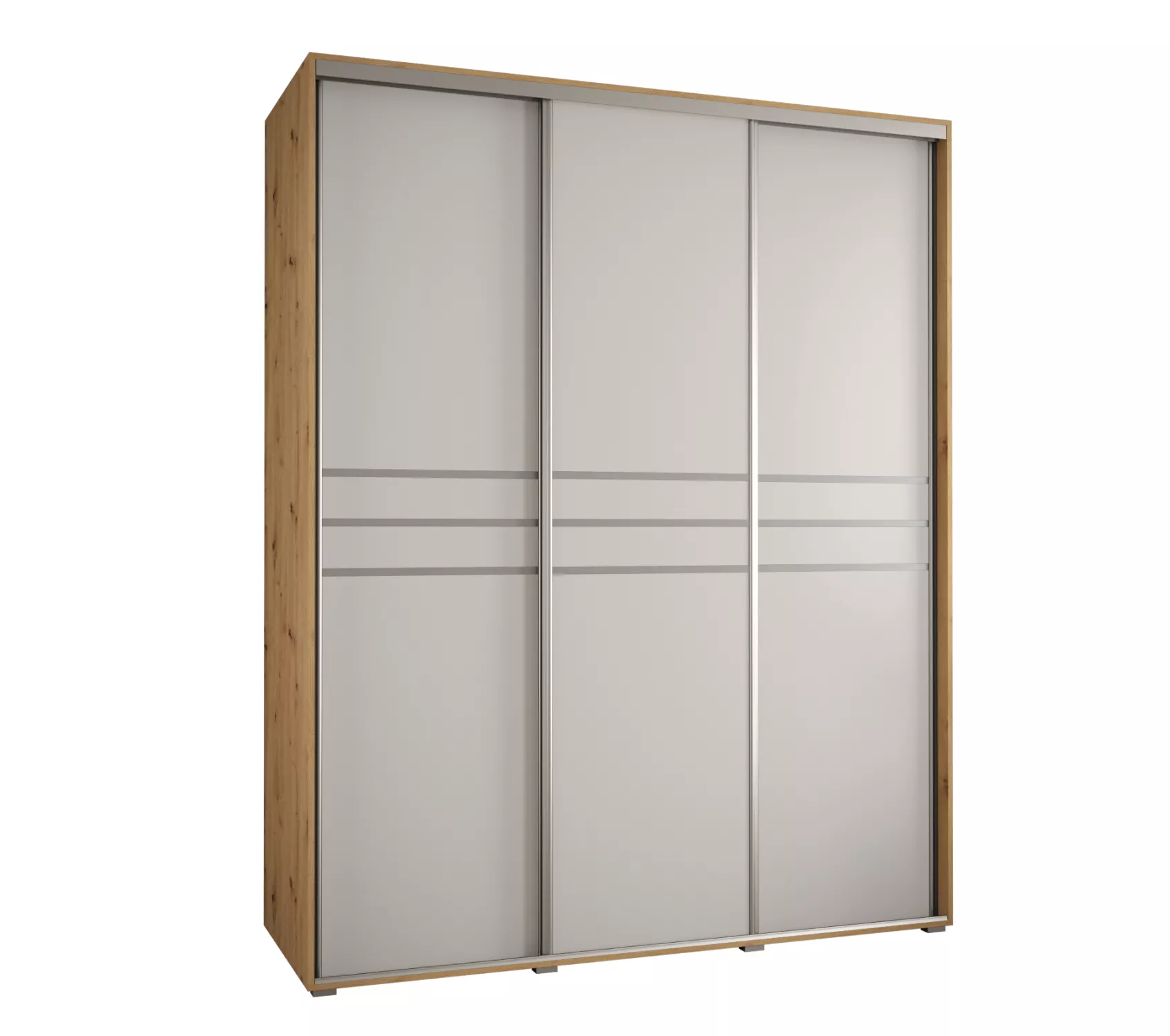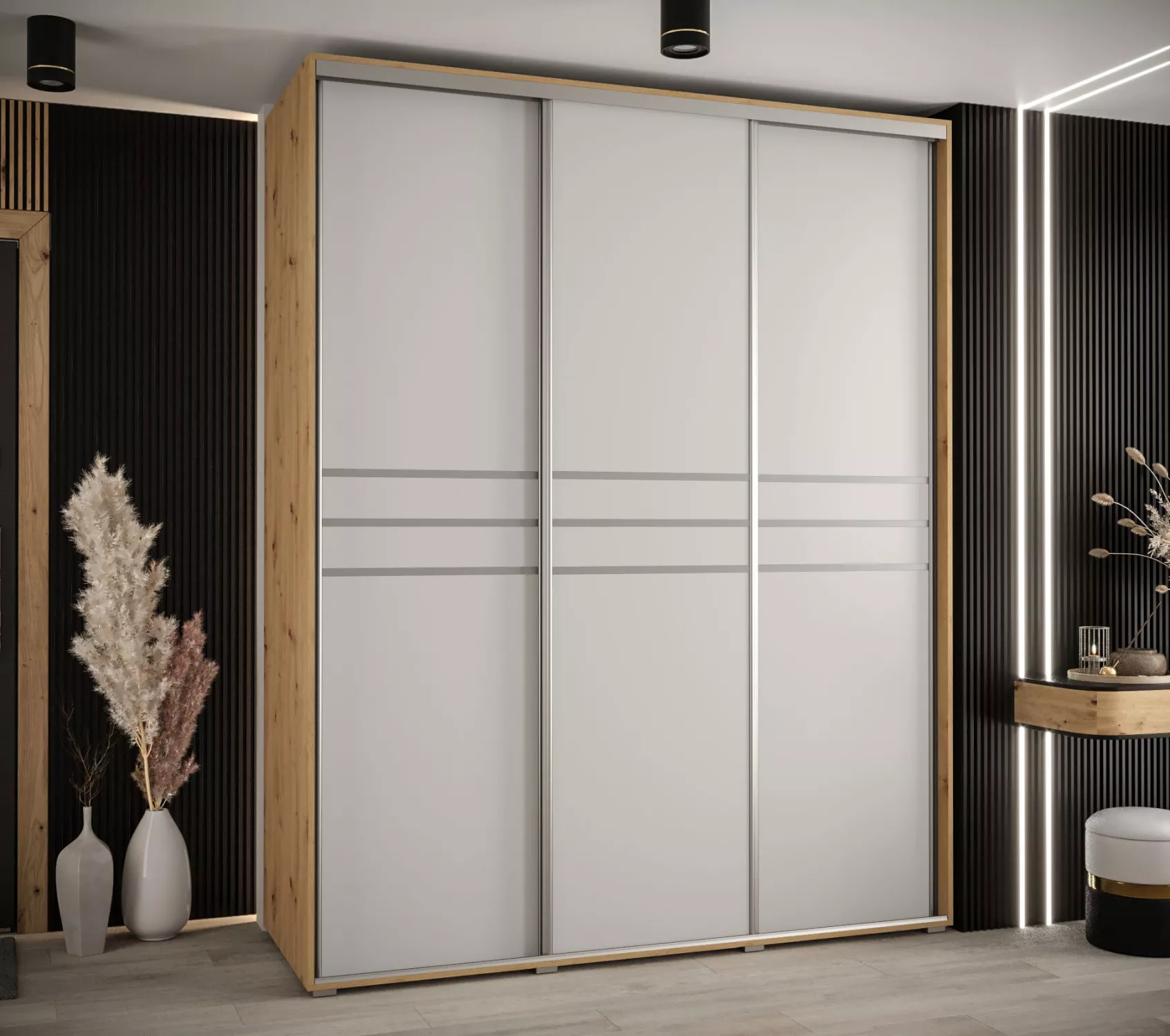 Šatní skříň ASIRI zaujme svým moderním designem a praktickými prvky. Šatní skříň má posuvné dveře, které se neotvírají do prostoru a ušetří tak spoustu místa.
