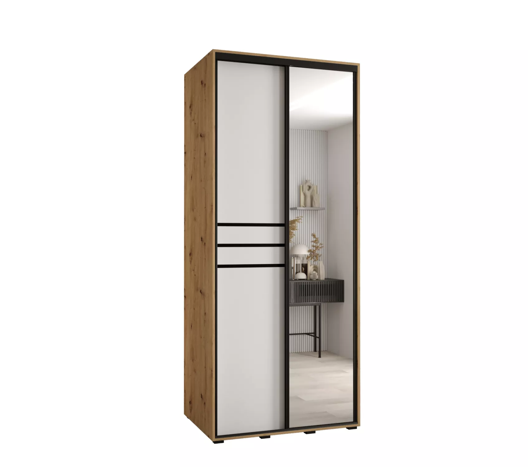 Úzká šatní skříň se zrcadlem ASIRI zaujme svým moderním designem a praktickými prvky. Skříň má posuvné dveře, které se neotvírají do prostoru a ušetří tak spoustu místa. Vnitřek skříně lze uspořádat dle vašich potřeb.