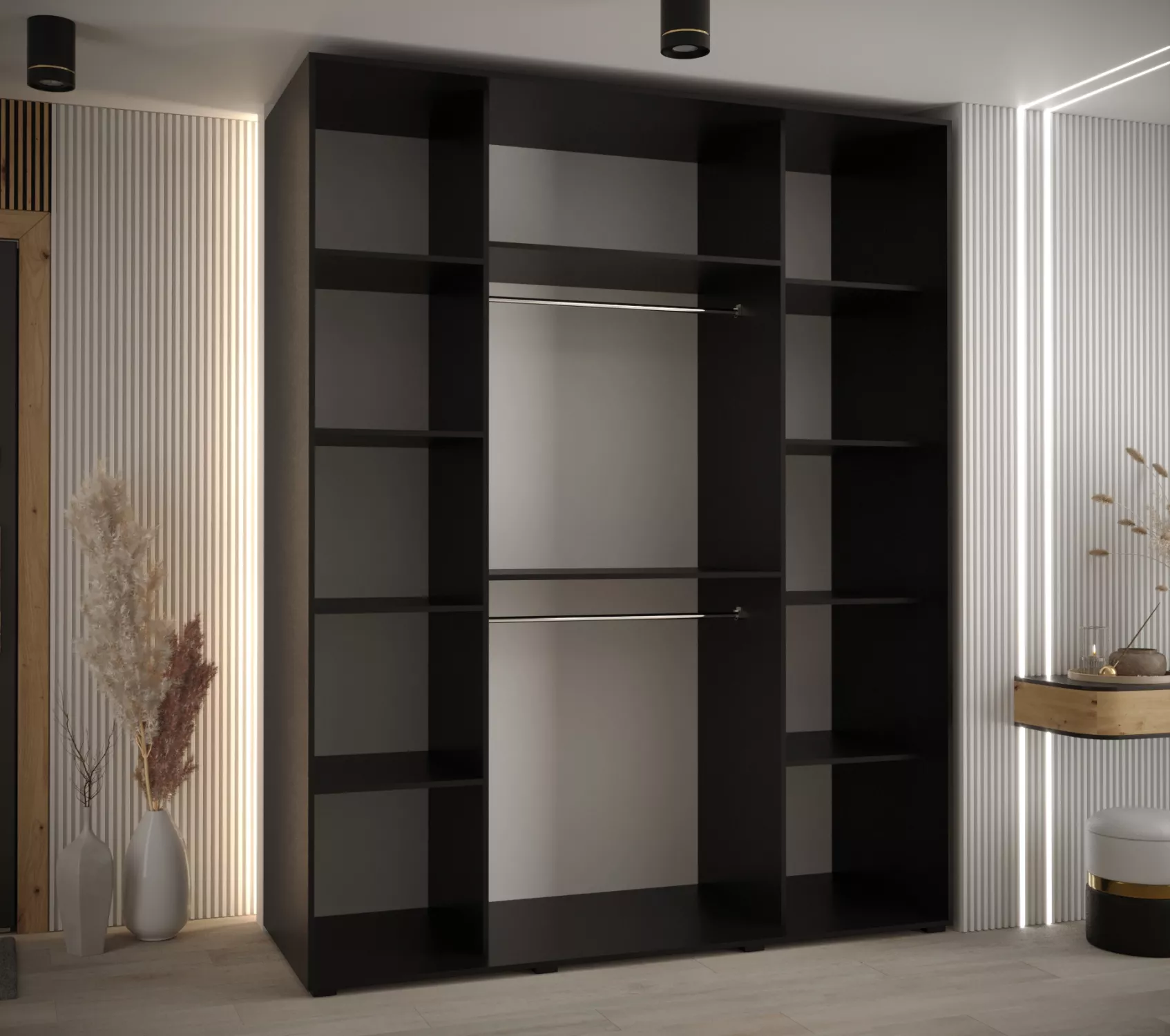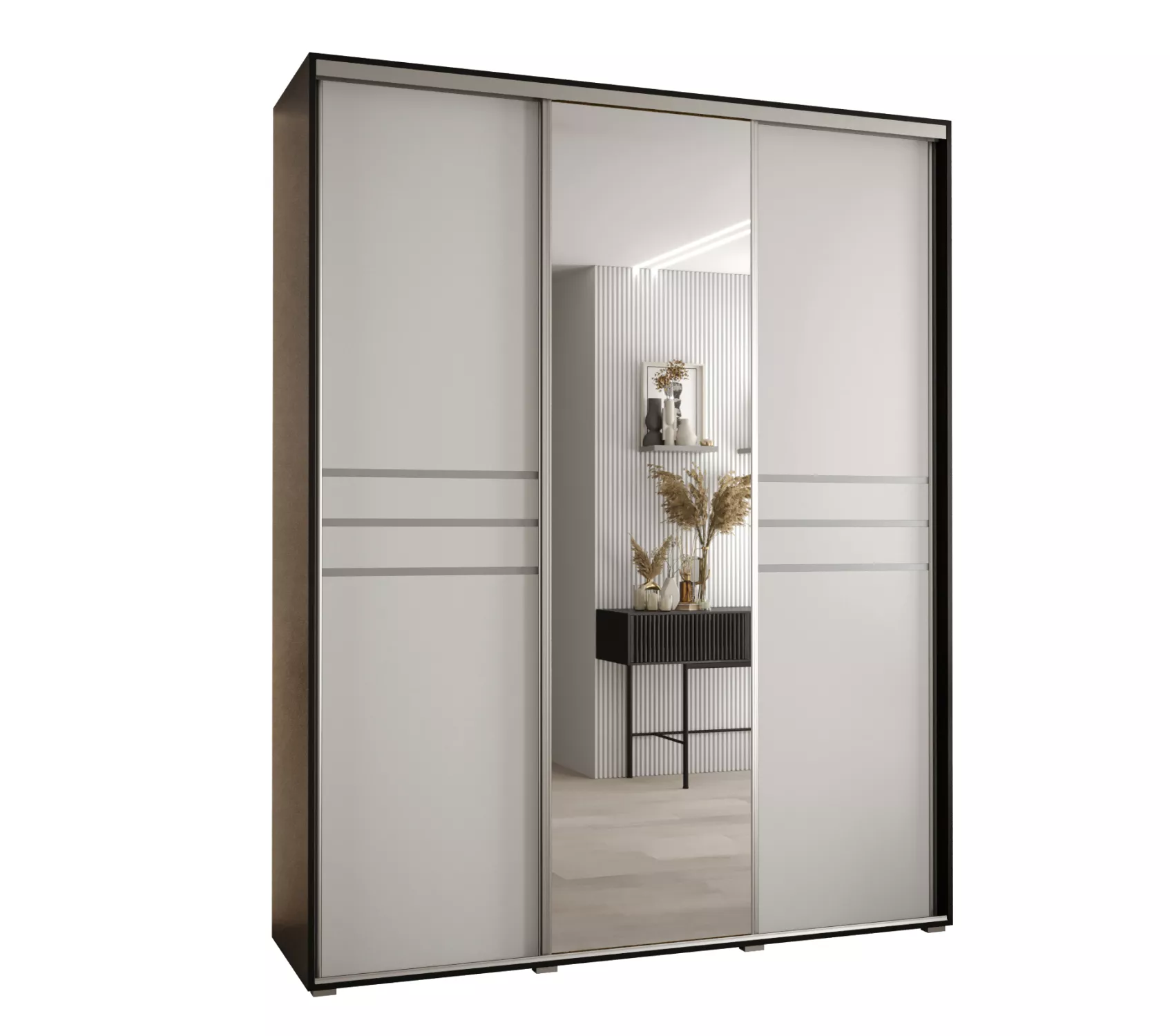 Velká šatní skříň se zrcadlem ASIRI zaujme svým moderním designem a praktickými prvky. Skříň má posuvné dveře, které se neotvírají do prostoru a ušetří tak spoustu místa. Vnitřek skříně lze uspořádat dle vašich potřeb.