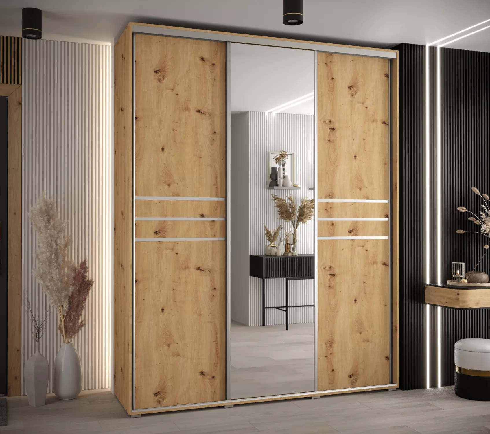 Velká šatní skříň se zrcadlem ASIRI zaujme svým moderním designem a praktickými prvky. Skříň má posuvné dveře, které se neotvírají do prostoru a ušetří tak spoustu místa. Vnitřek skříně lze uspořádat dle vašich potřeb.