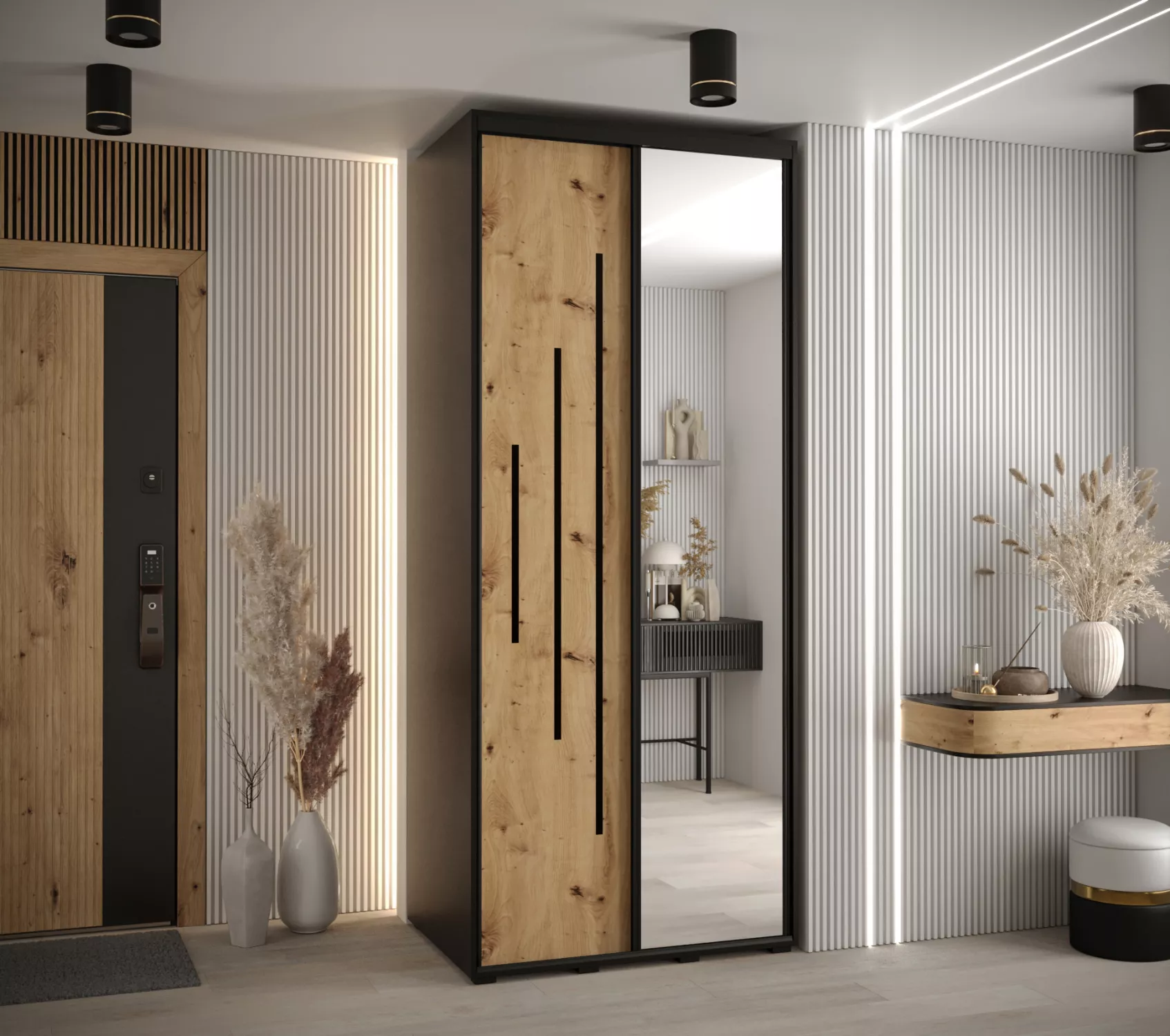Úzká šatní skříň se zrcadlem ASIRI zaujme svým moderním designem a praktickými prvky. Skříň má posuvné dveře, které se neotvírají do prostoru a ušetří tak spoustu místa. Vnitřek skříně lze uspořádat dle vašich potřeb.