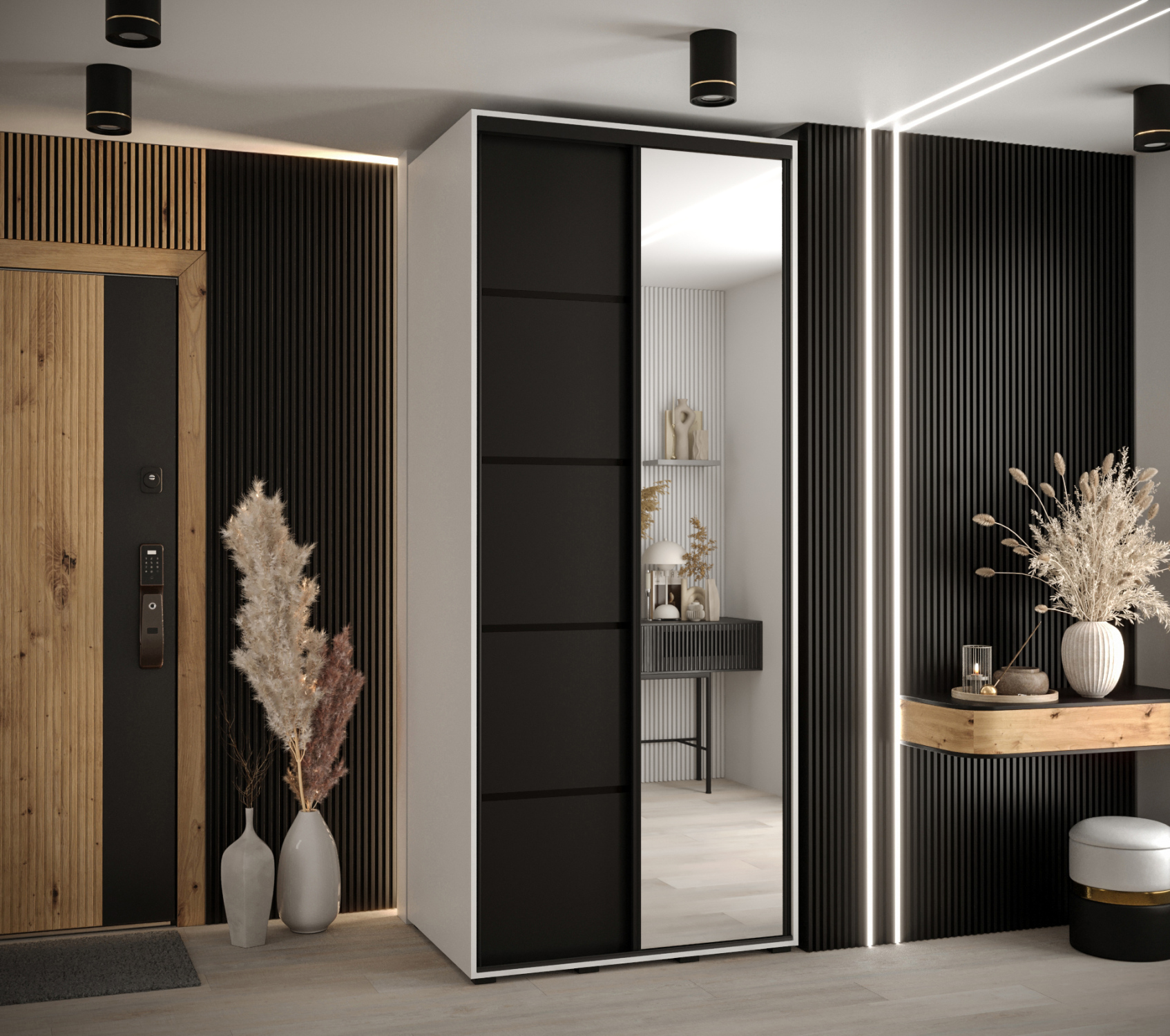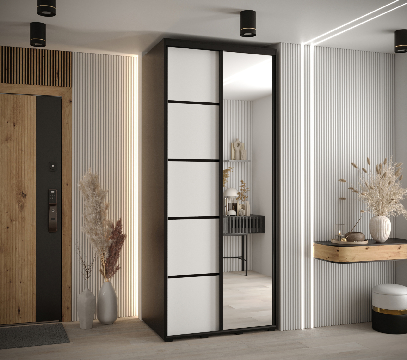 Úzká šatní skříň se zrcadlem ASIRI zaujme svým moderním designem a praktickými prvky. Skříň má posuvné dveře, které se neotvírají do prostoru a ušetří tak spoustu místa. Vnitřek skříně lze uspořádat dle vašich potřeb.