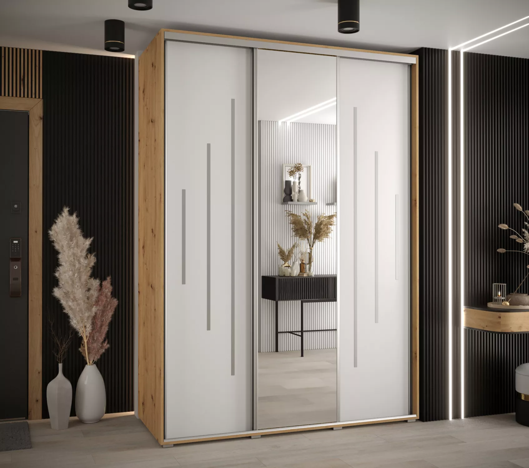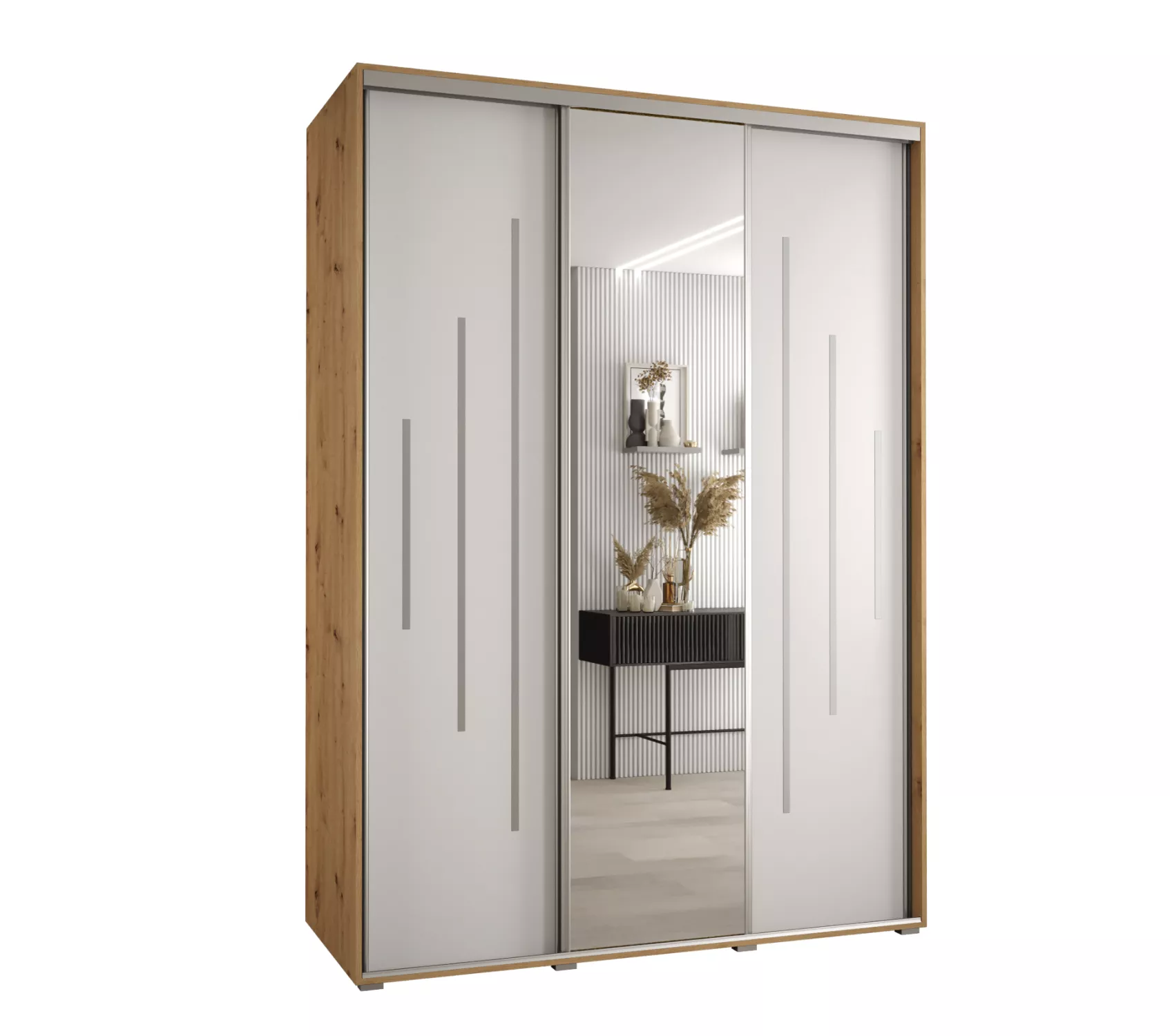 Vysoká šatní skříň se zrcadlem ASIRI zaujme svým moderním designem a praktickými prvky. Skříň má posuvné dveře, které se neotvírají do prostoru a ušetří tak spoustu místa. Vnitřek skříně lze uspořádat dle vašich potřeb.