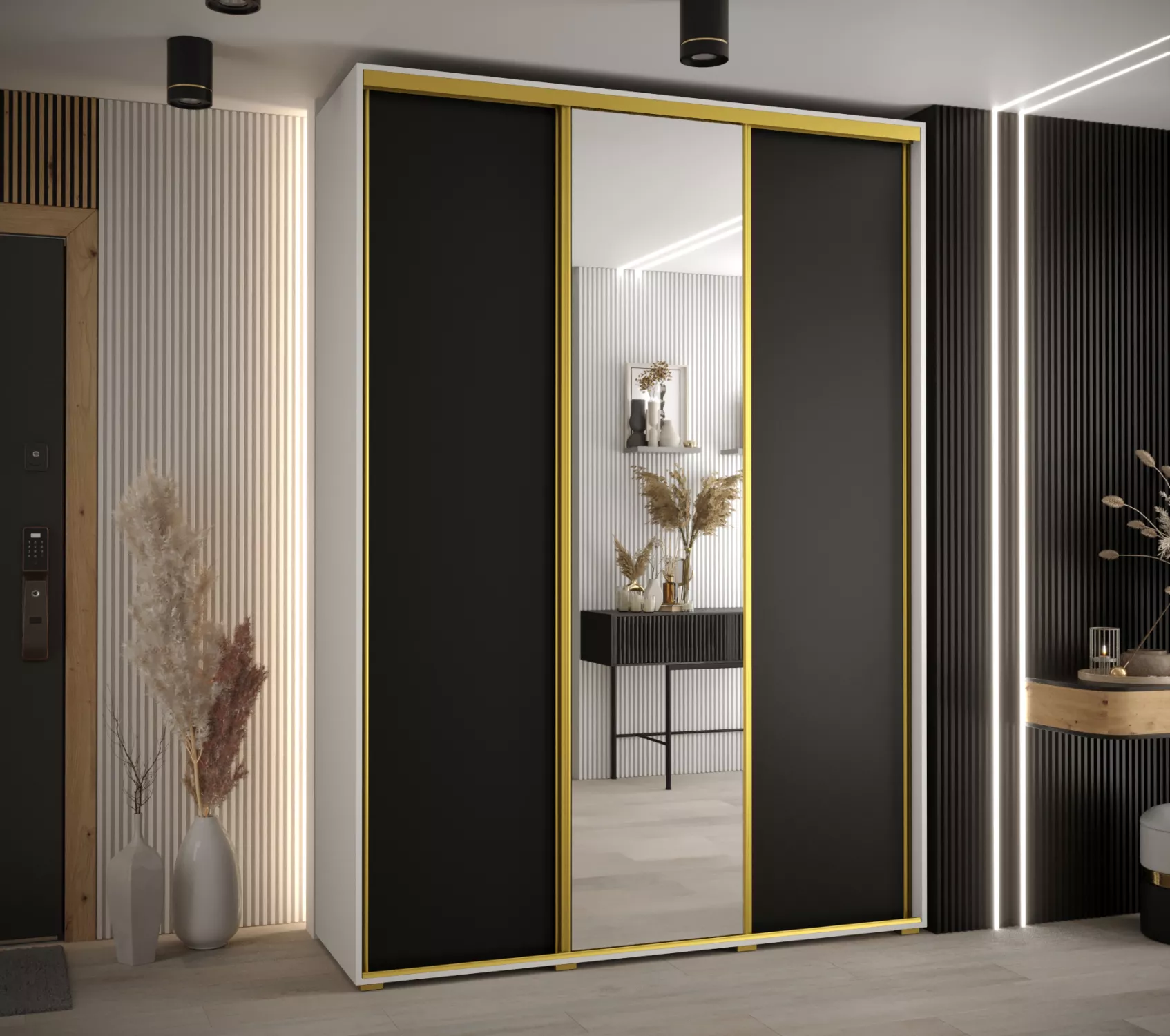 Šatní skříň YVONA 3 - 180/45 cm, bílá / černá / zlatá