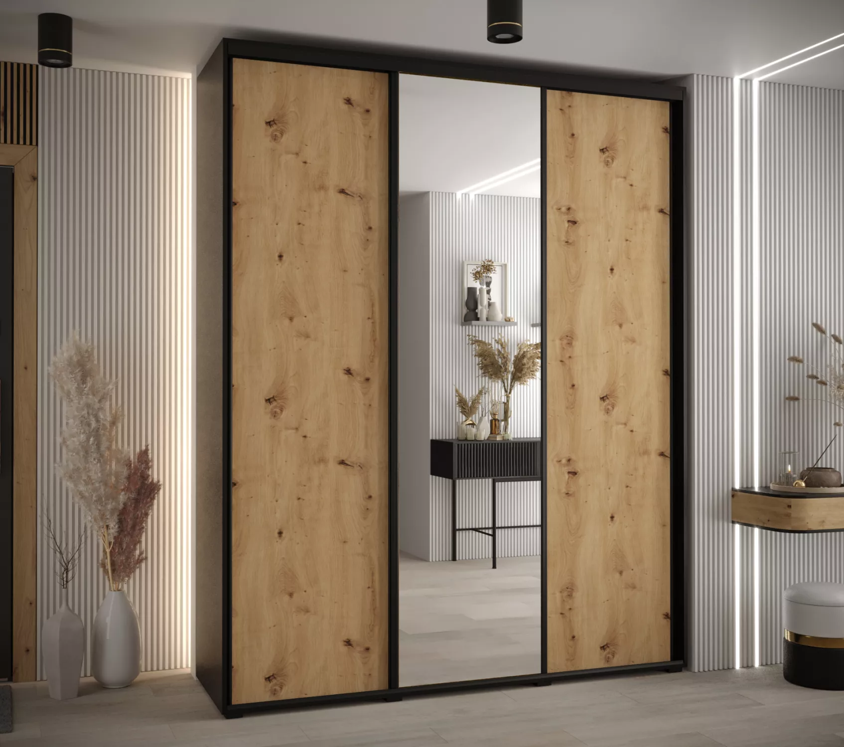 Šatní skříň YVONA 3 - 200/45 cm, černá / dub artisan / černá