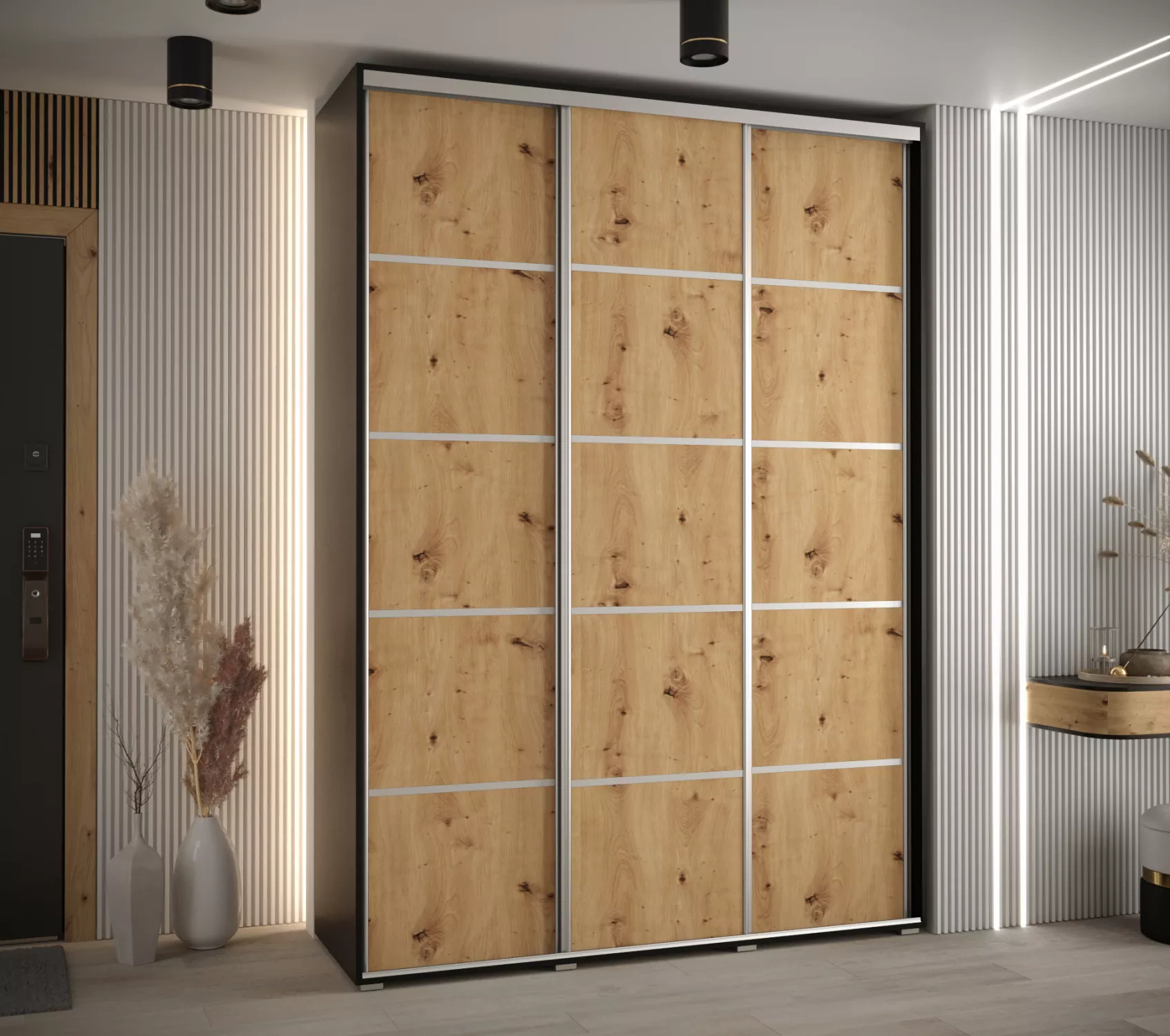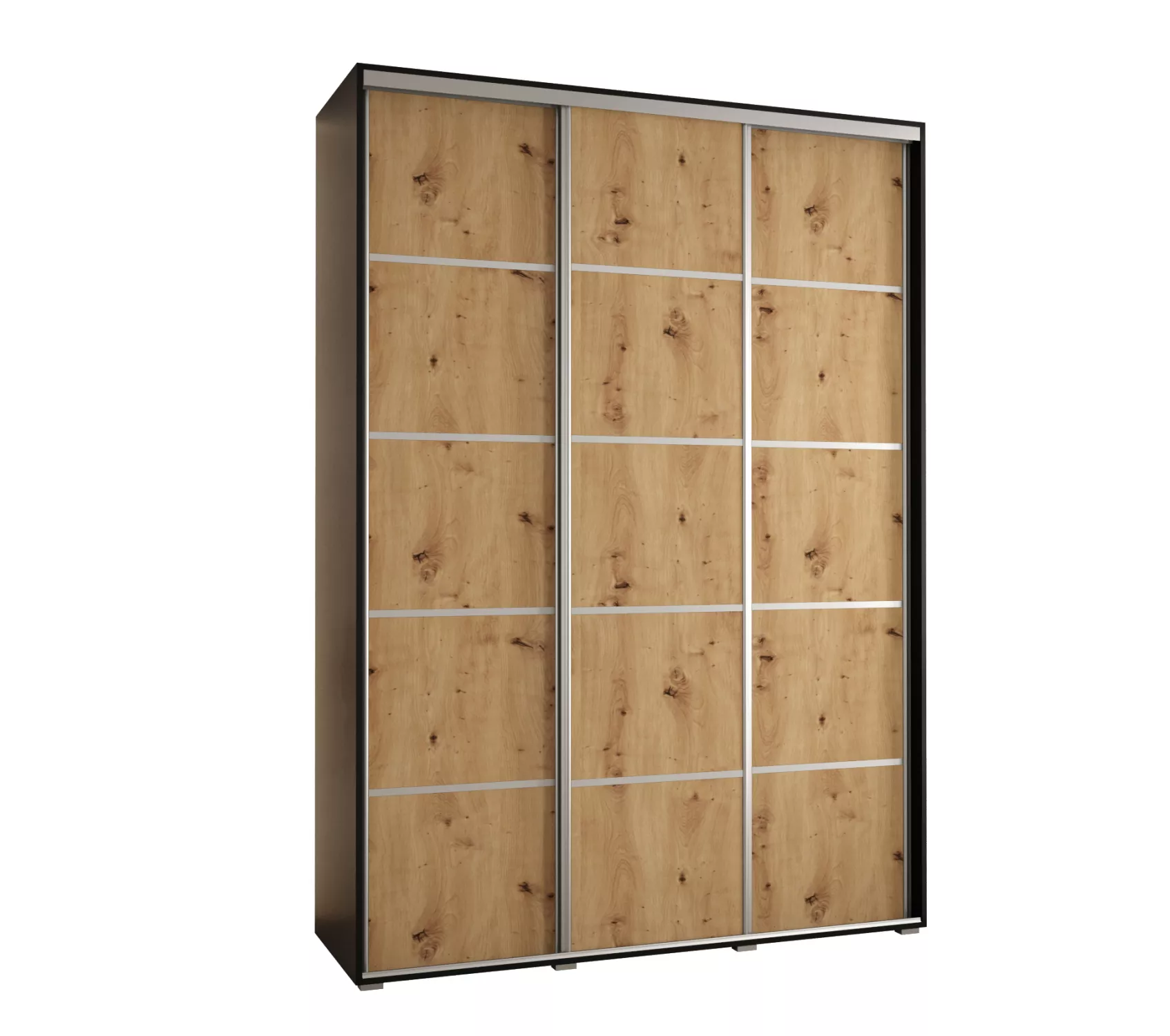 Šatní skříň YVONA 4 - 170/45 cm, černá / dub artisan / stříbrná