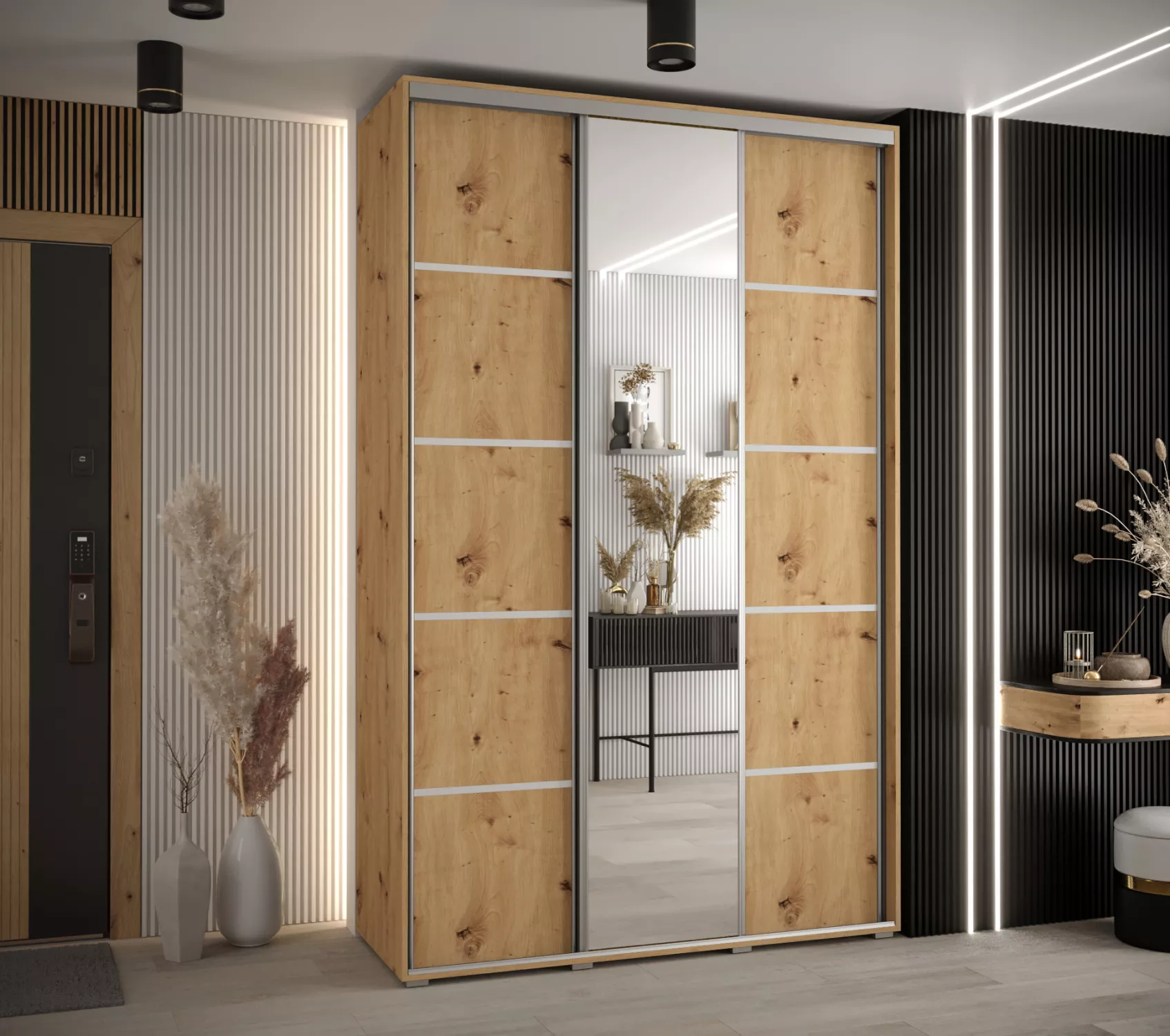 Šatní skříň YVONA 5 - 150/45 cm, dub artisan / stříbrná