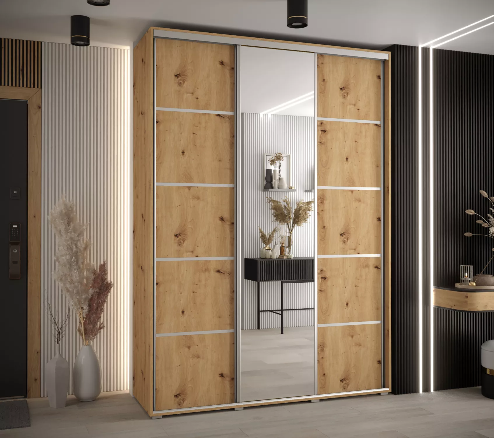 Šatní skříň YVONA 5 - 170/45 cm, dub artisan / stříbrná