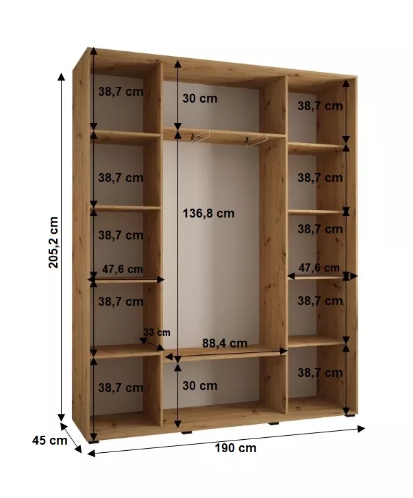 Součástí skříně jsou police i 4 výsuvné šatní tyče. Šuplíky do skříně najdete v sekci Doporučujeme přikoupit.