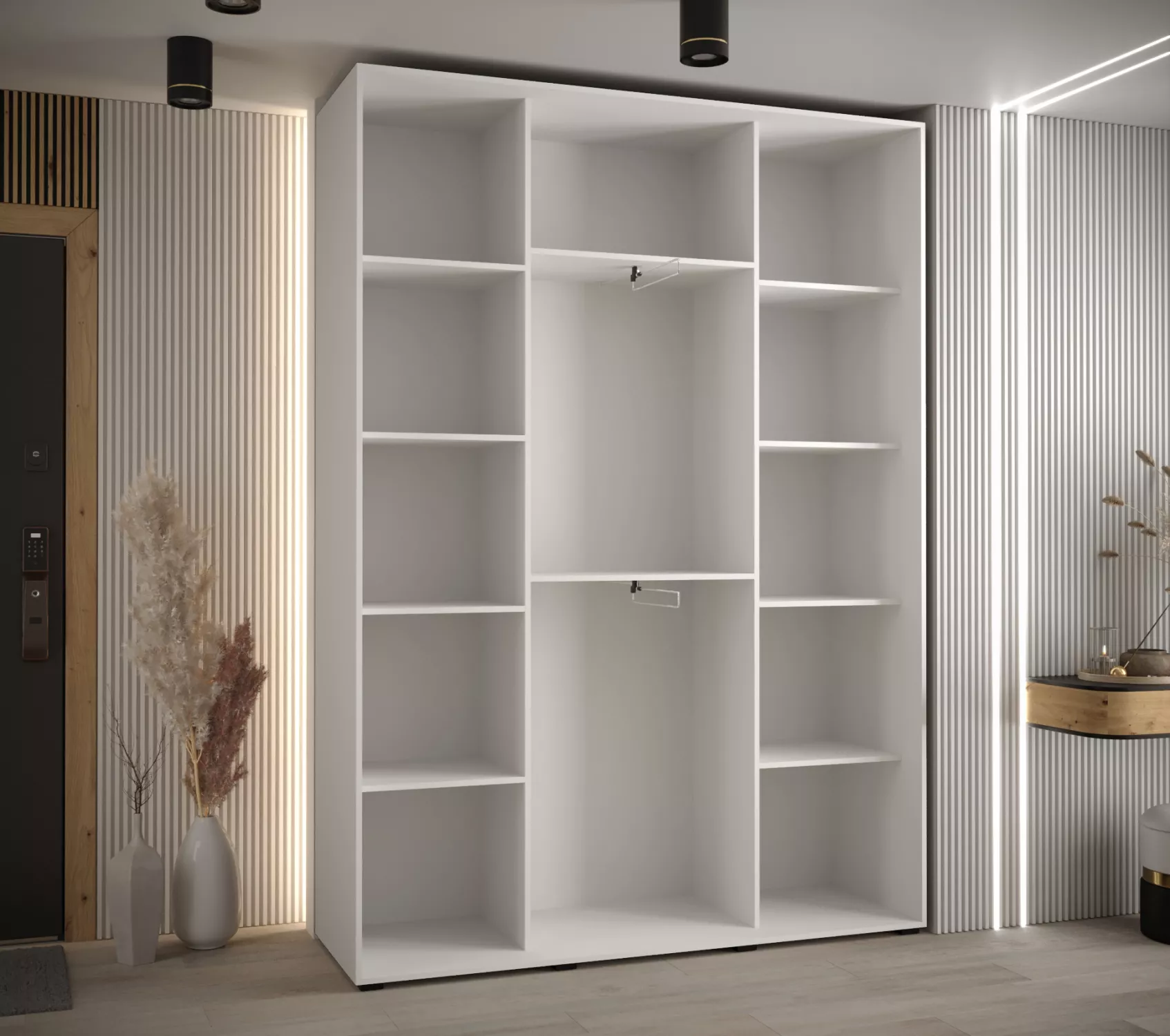 Součástí skříně jsou police i 2 výsuvné šatní tyče. Šuplíky do skříně najdete v sekci Doporučujeme přikoupit.