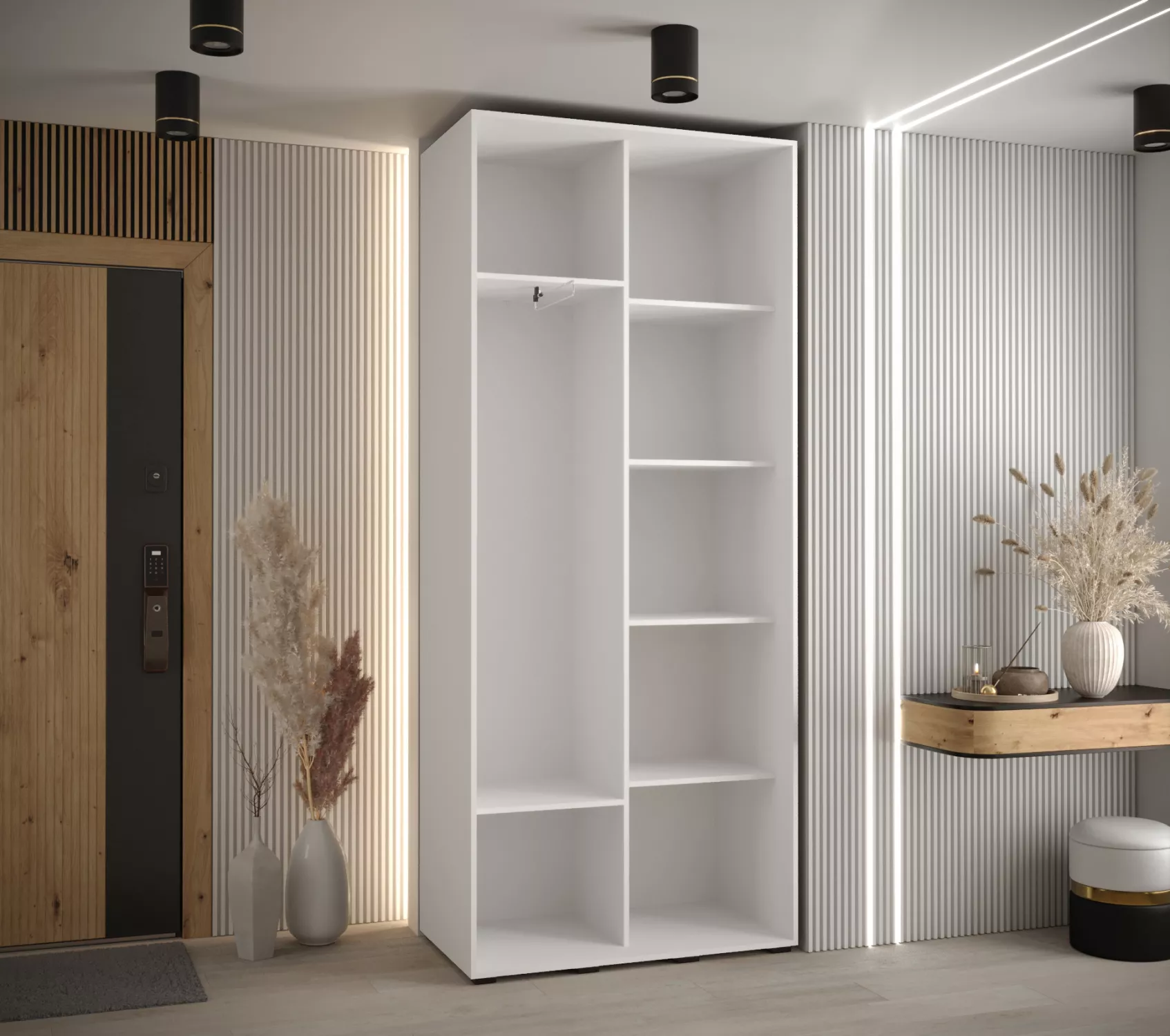 Součástí skříně jsou police i 2 výsuvné šatní tyče. Šuplíky do skříně najdete v sekci Doporučujeme přikoupit.