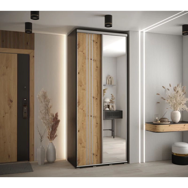 Šatní skříň YVONA 7 - 120/45 cm, černá / dub artisan / stříbrná