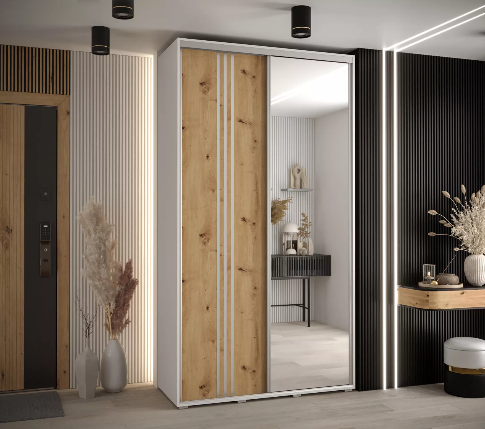 Šatní skříň YVONA 7 - 140/45 cm, bílá / dub artisan / stříbrná