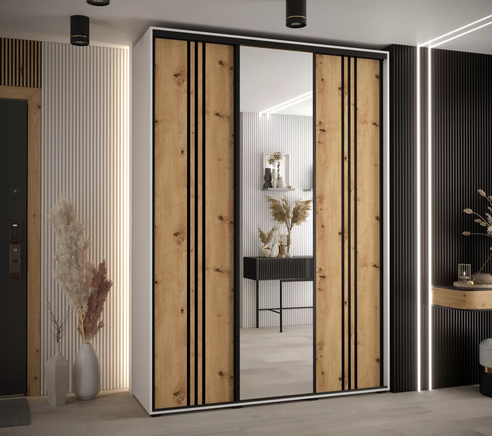 Šatní skříň YVONA 7 - 170/45 cm, bílá / dub artisan / černá