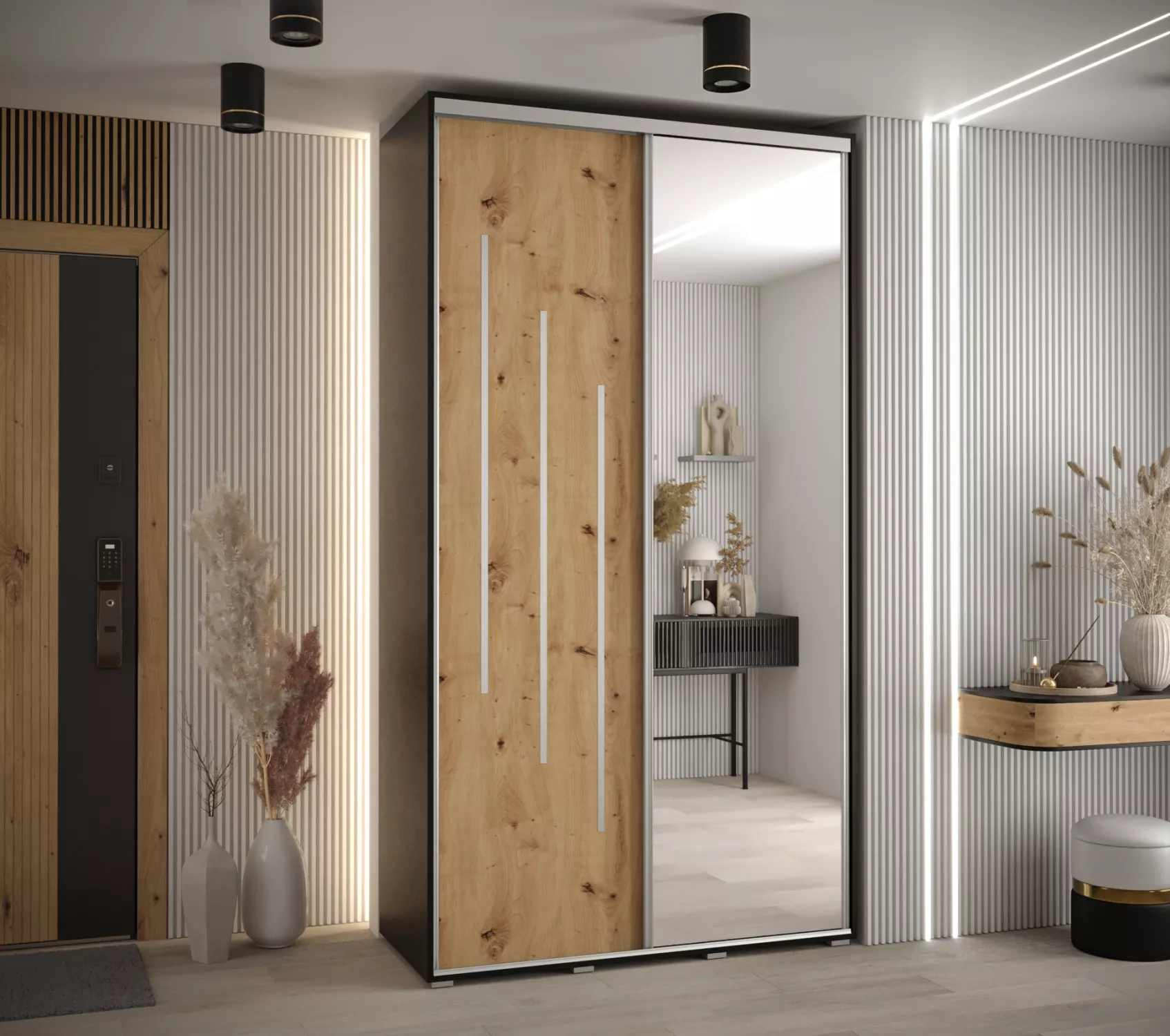 Šatní skříň YVONA 9 - 130/45 cm, černá / dub artisan / stříbrná