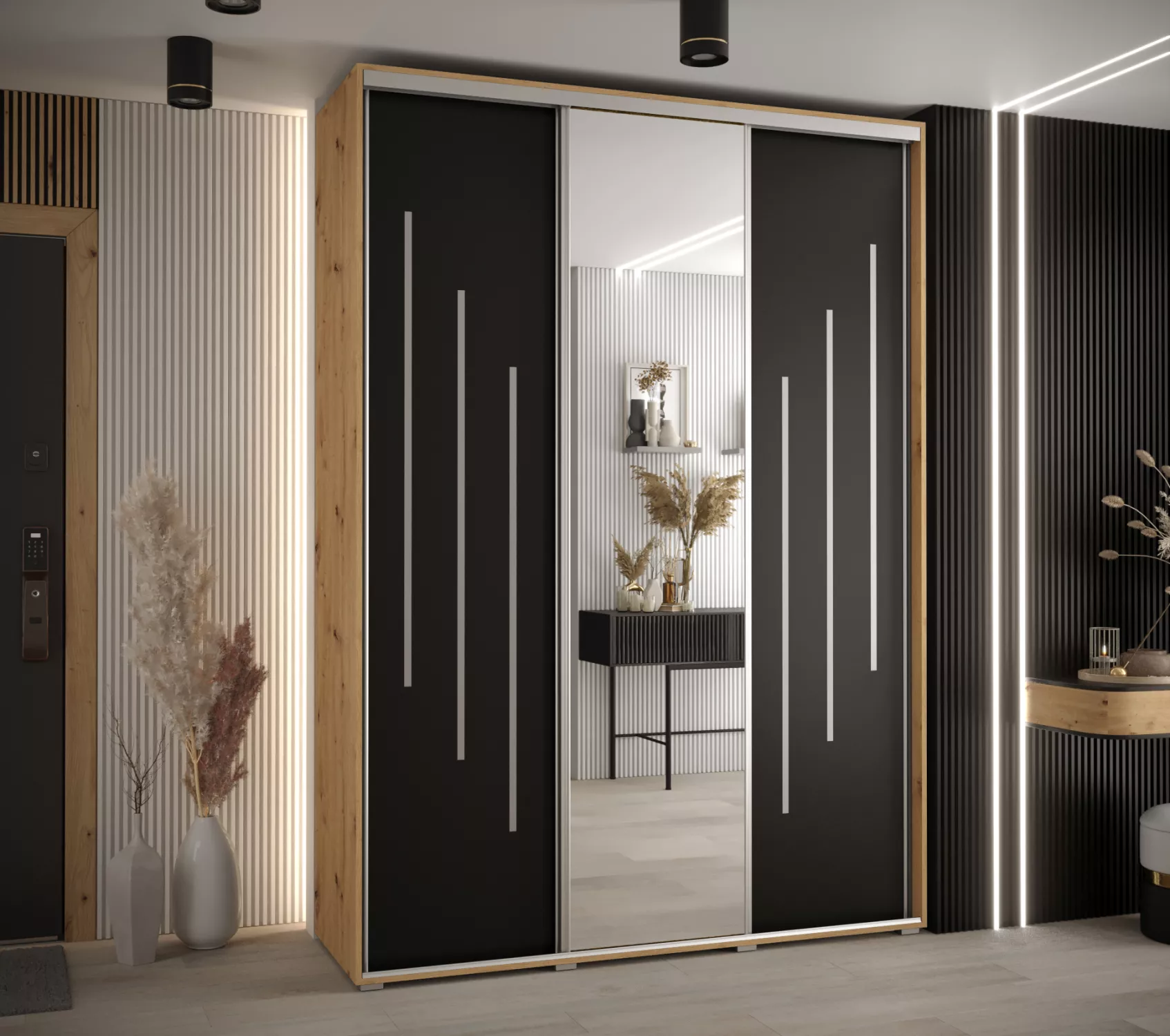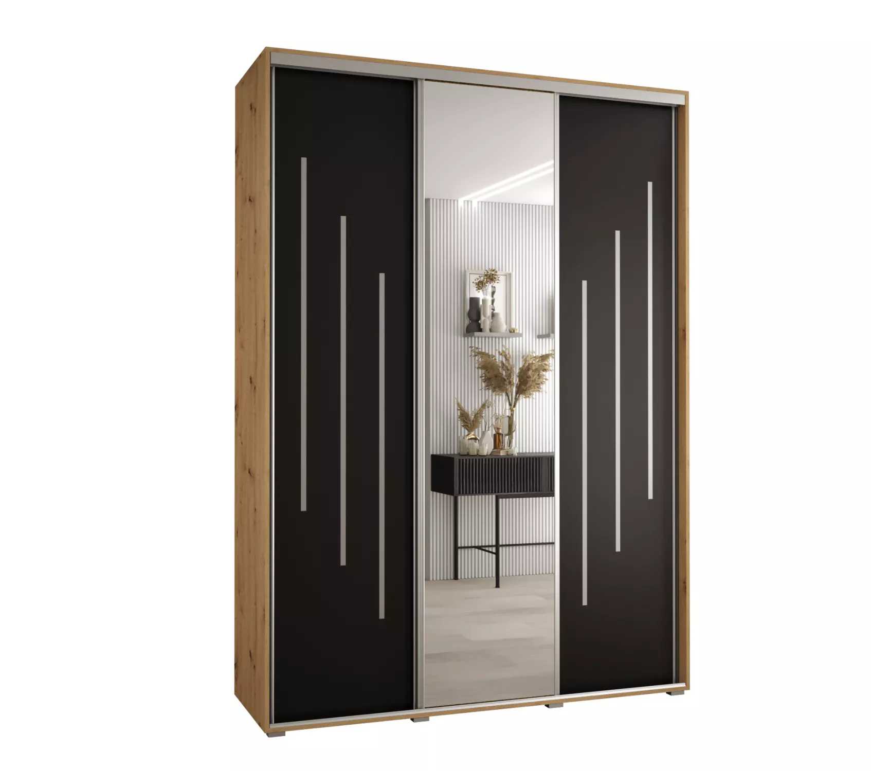 Šatní skříň YVONA 9 - 170/45 cm, dub artisan / černá / stříbrná