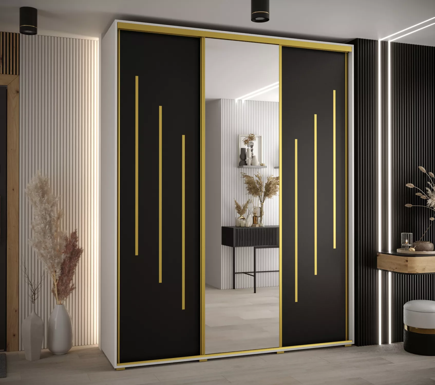 Šatní skříň YVONA 9 - 200/45 cm, bílá / černá / zlatá