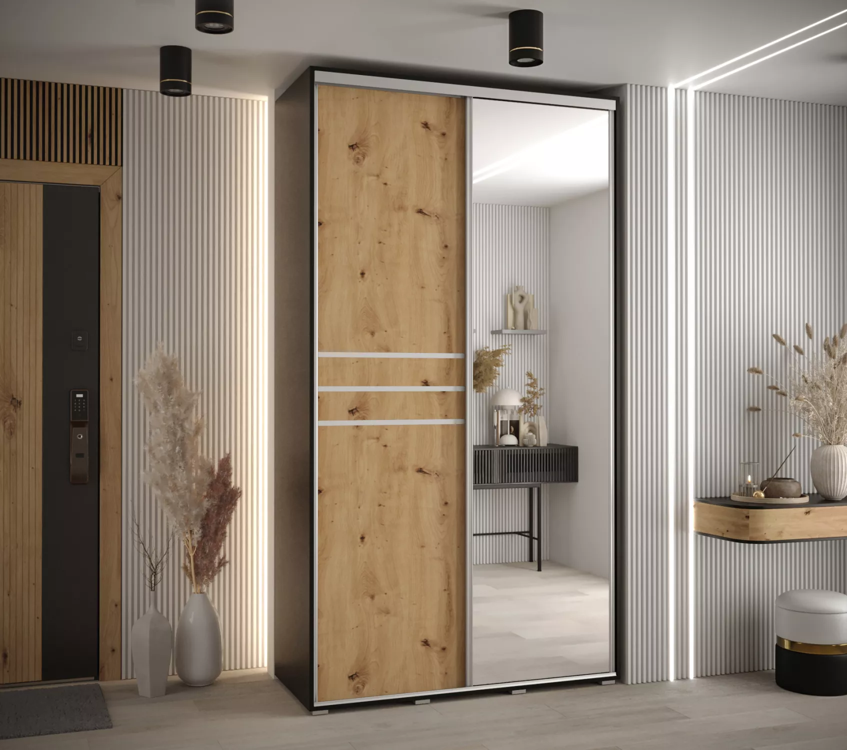 Šatní skříň YVONA 11 - 140/45 cm, černá / dub artisan / stříbrná