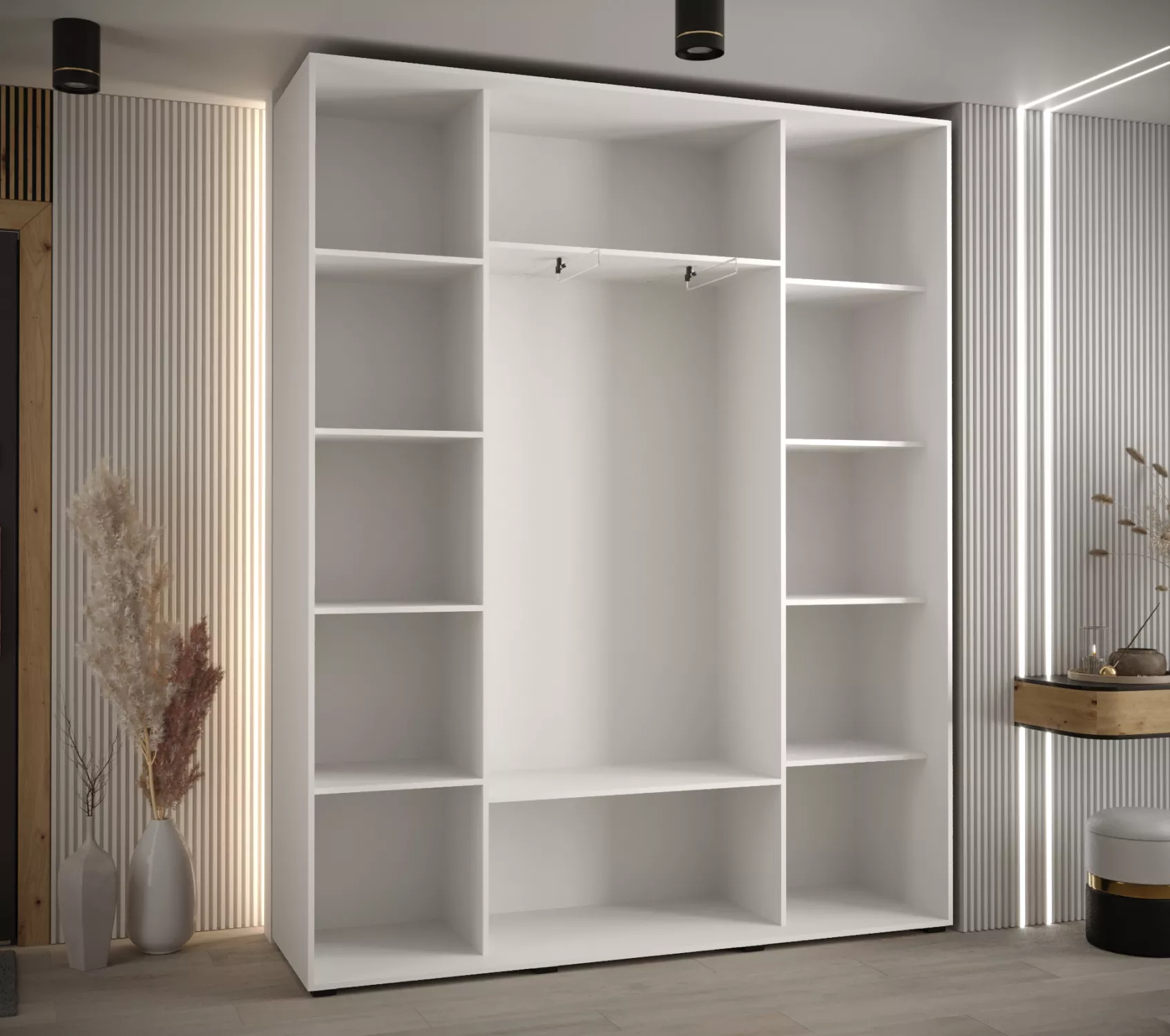 Součástí skříně jsou police i 4 výsuvné šatní tyče. Šuplíky do skříně najdete v sekci Doporučujeme přikoupit.