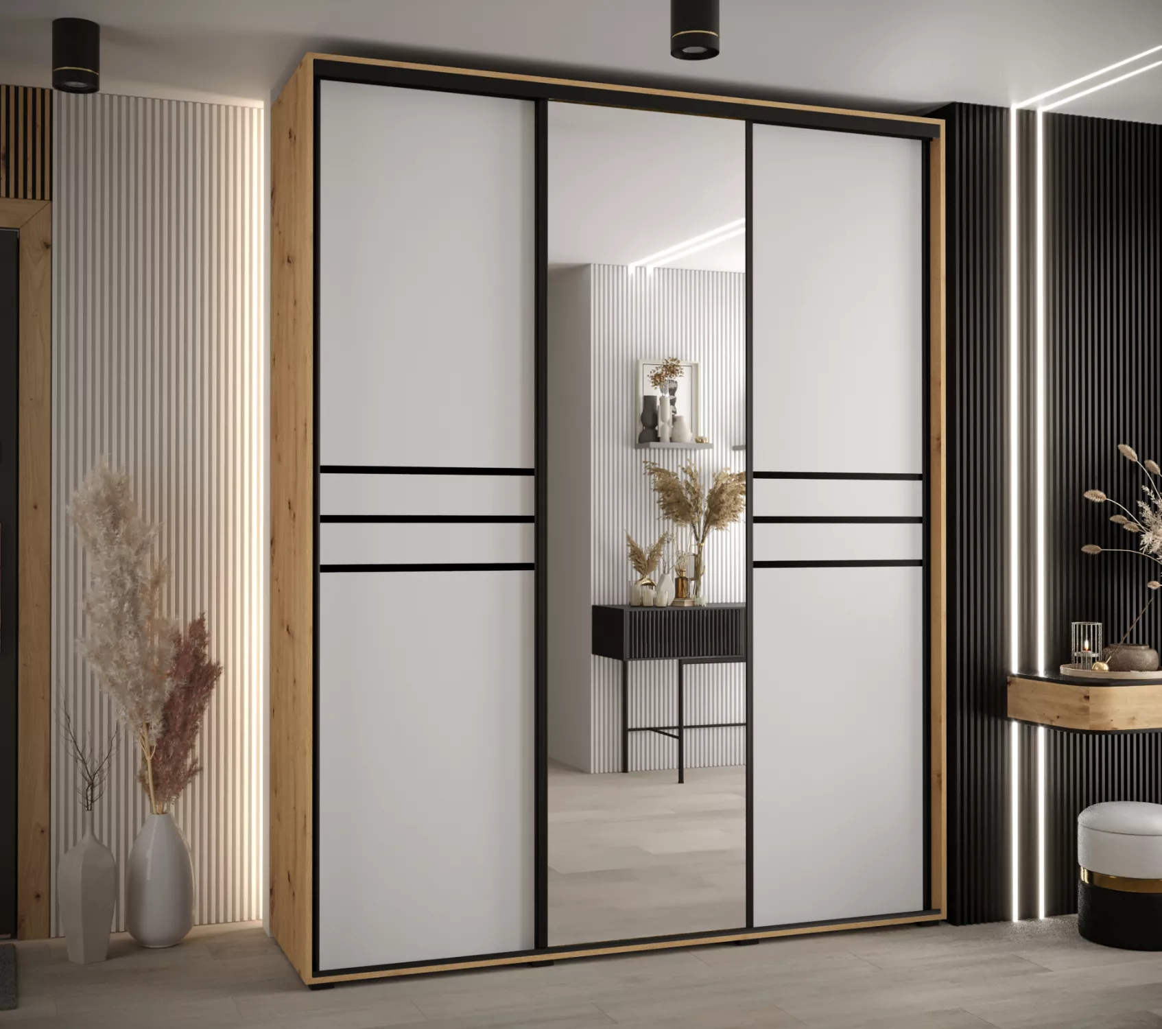 Šatní skříň YVONA 11 - 200/45 cm, dub artisan / bílá / černá