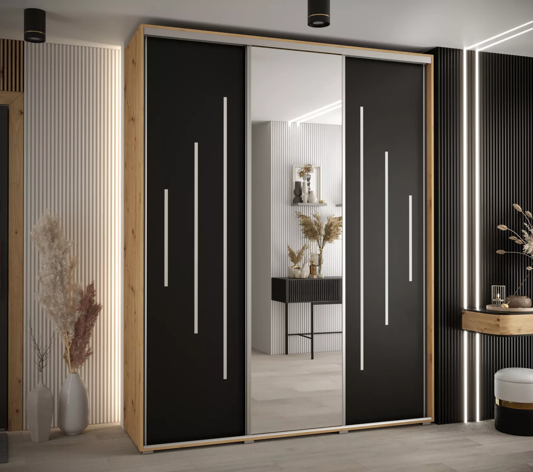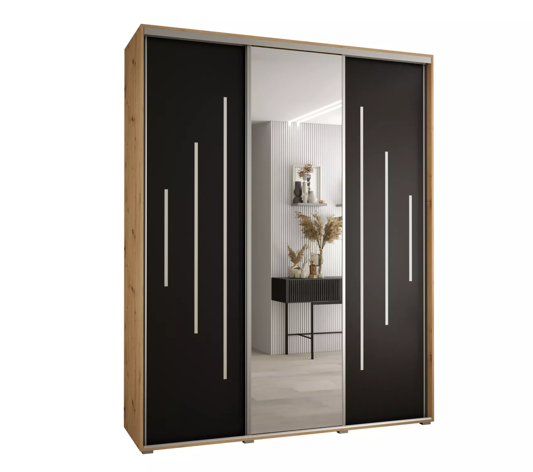 Šatní skříň YVONA 13 - 200/45 cm, dub artisan / černá / stříbrná