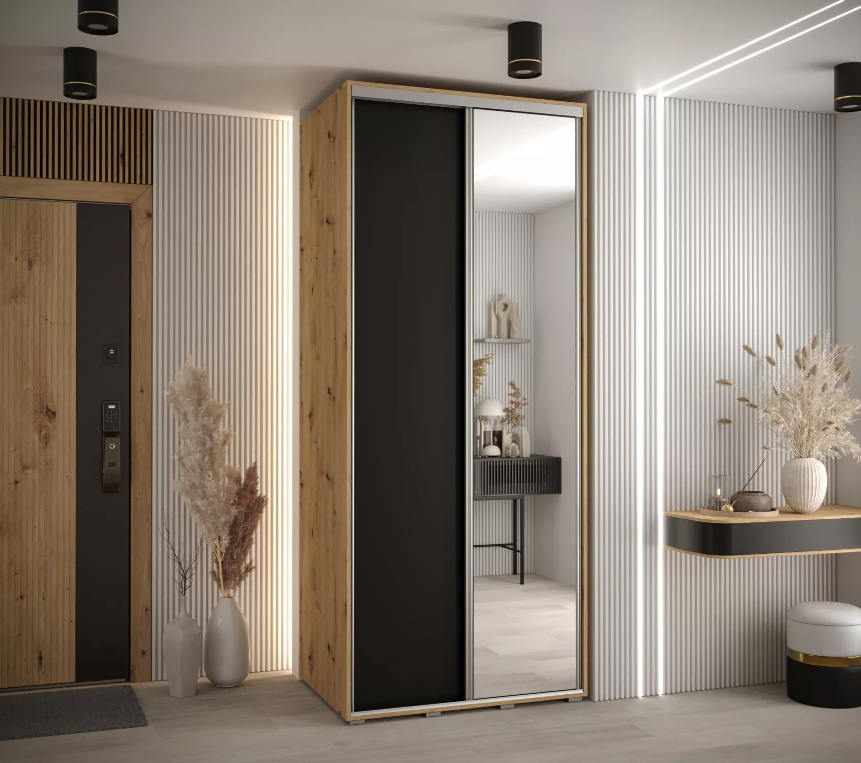 Šatní skříň YVONA 3 - 100/60 cm, dub artisan / černá / stříbrná