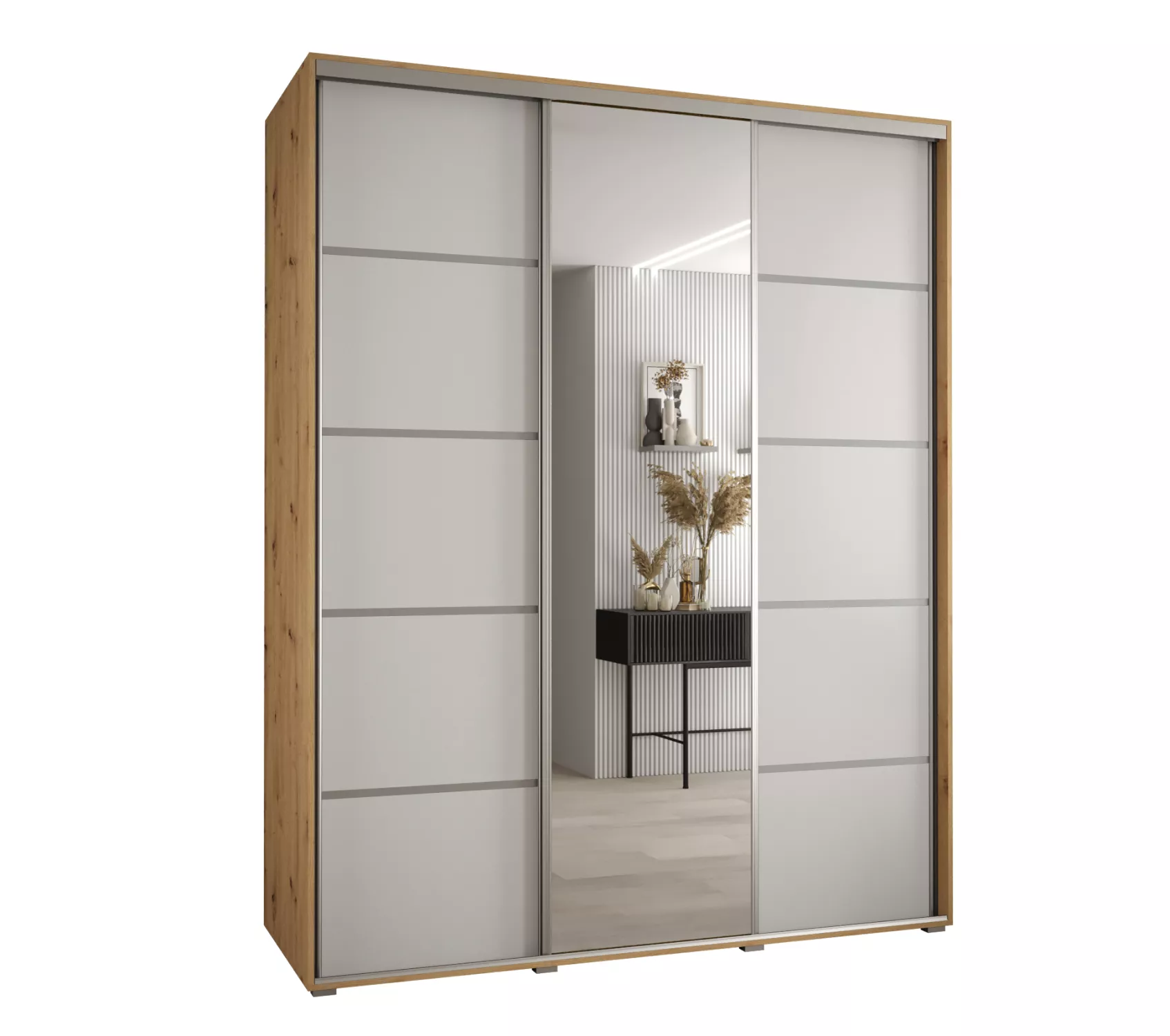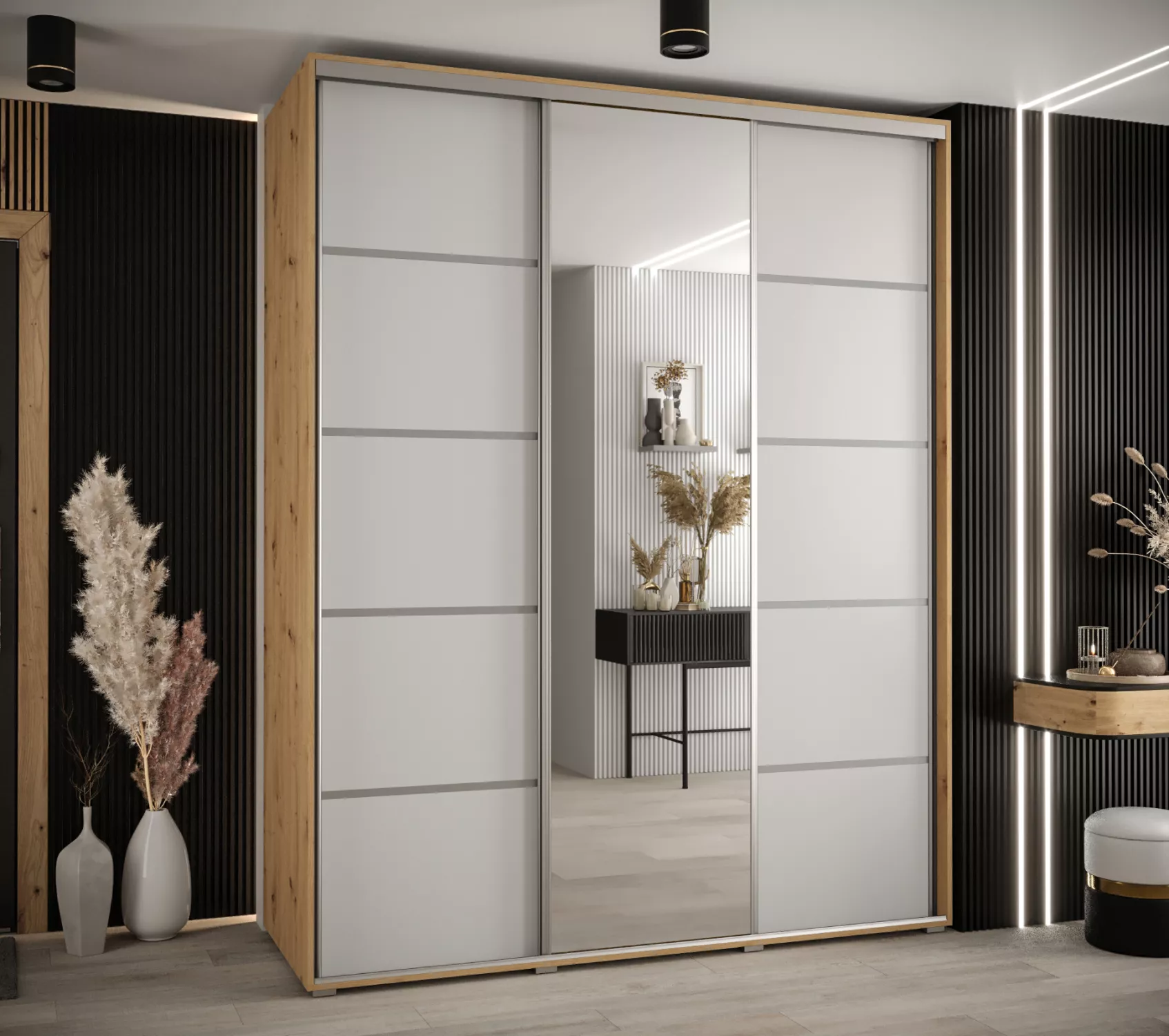 Šatní skříň YVONA 5 - 190/60 cm, dub artisan / bílá / stříbrná