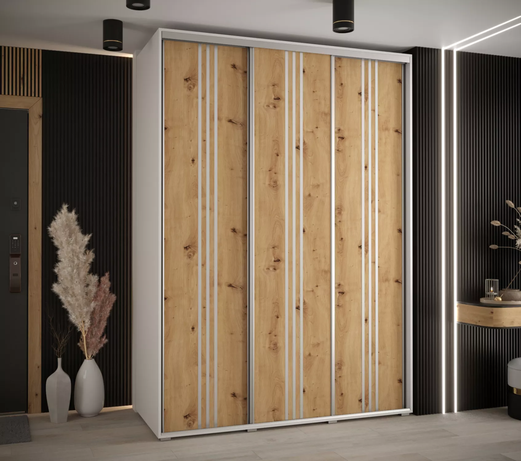Šatní skříň YVONA 6 - 170/60 cm, bílá / dub artisan / stříbrná