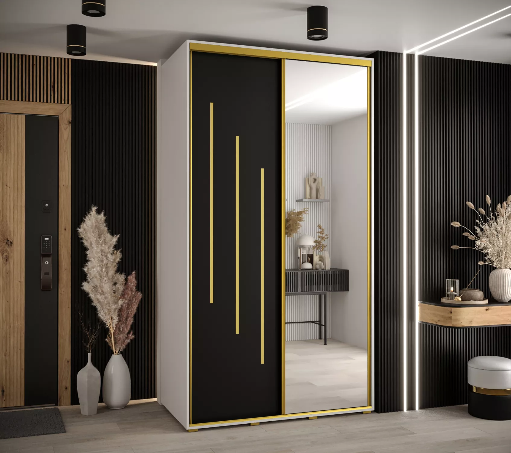 Šatní skříň YVONA 9 - 140/60 cm, bílá / černá / zlatá