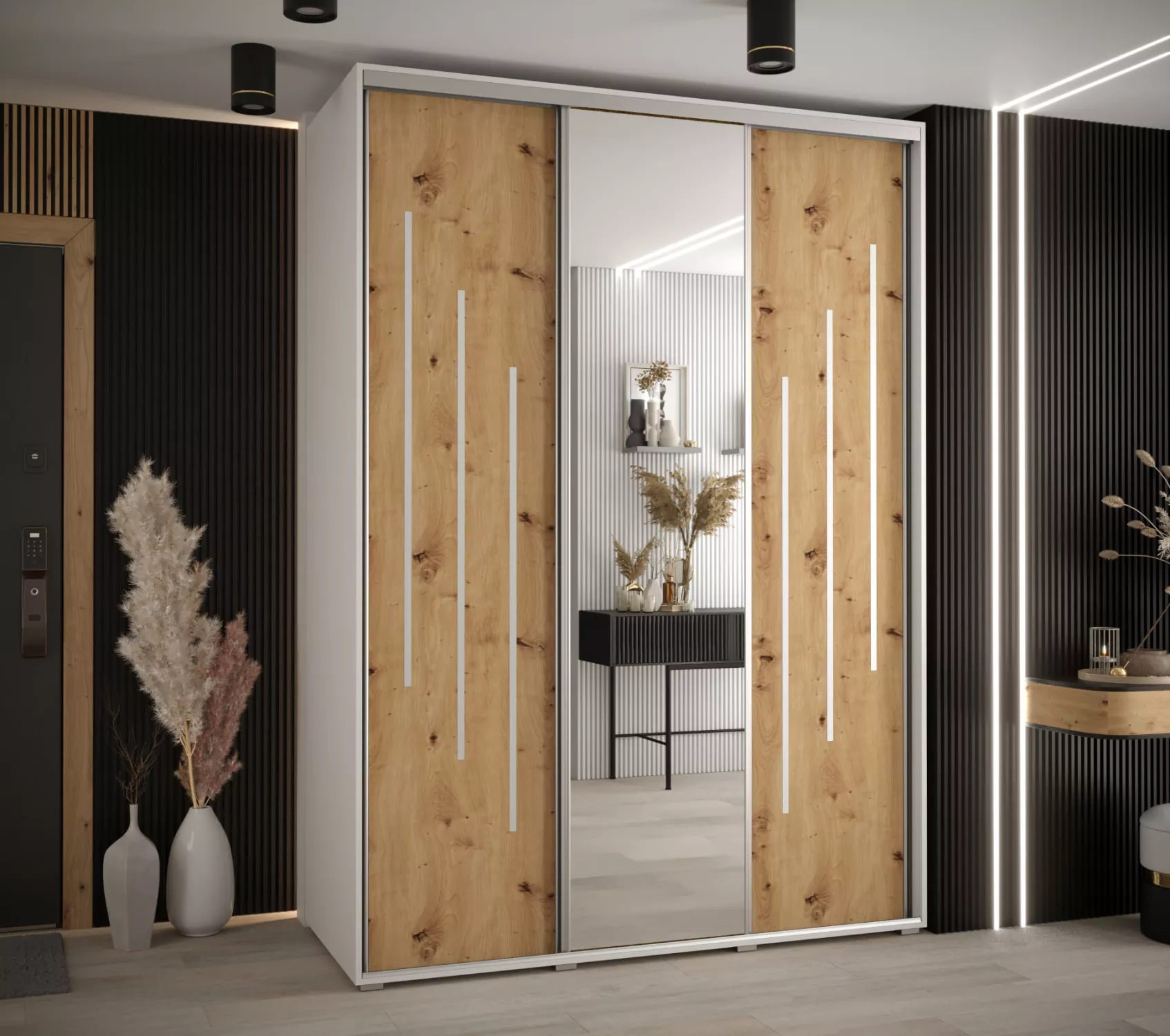 Šatní skříň YVONA 9 - 170/60 cm, bílá / dub artisan / stříbrná