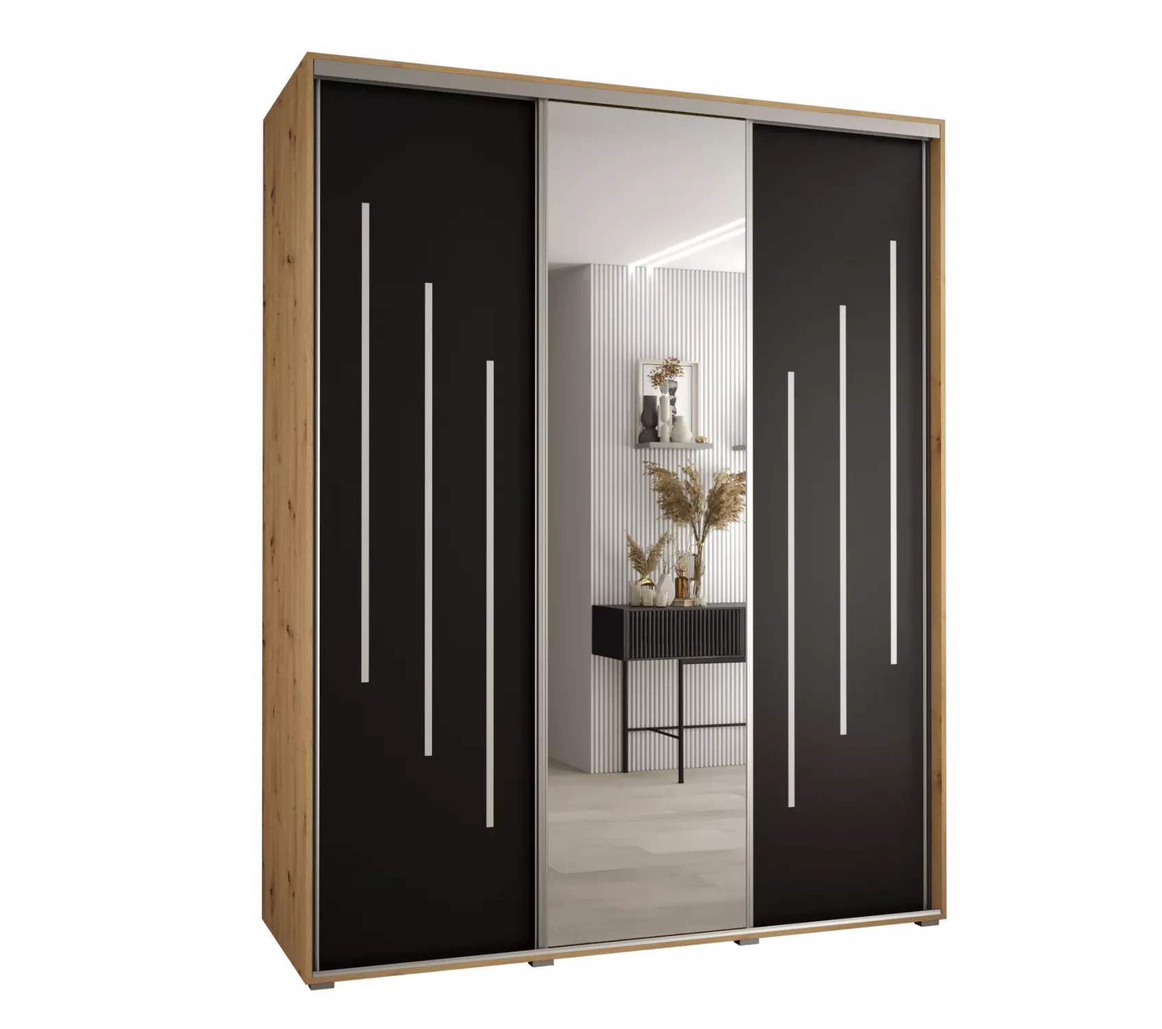 Šatní skříň YVONA 9 - 200/60 cm, dub artisan / černá / stříbrná