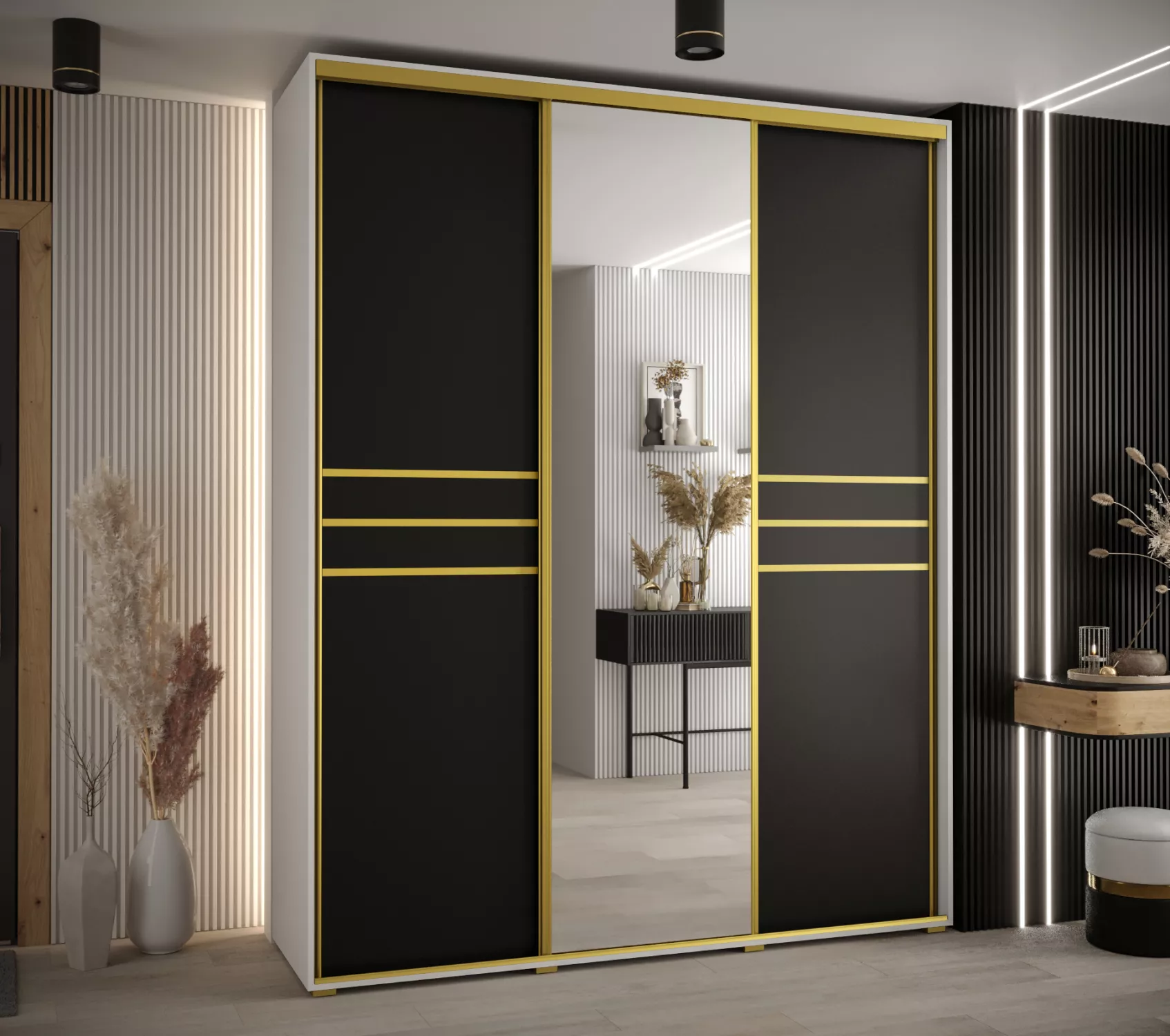 Šatní skříň YVONA 11 - 190/60 cm, bílá / černá / zlatá