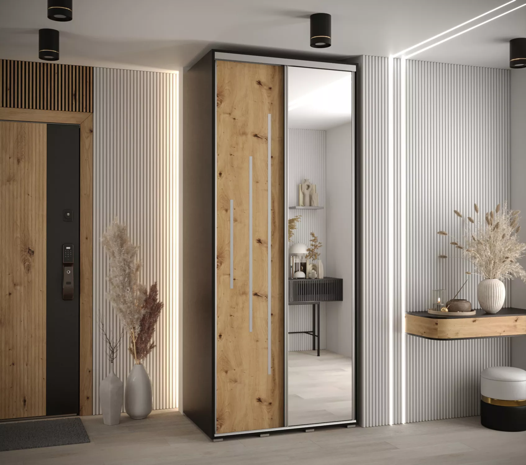 Šatní skříň YVONA 13 - 110/60 cm, černá / dub artisan / stříbrná