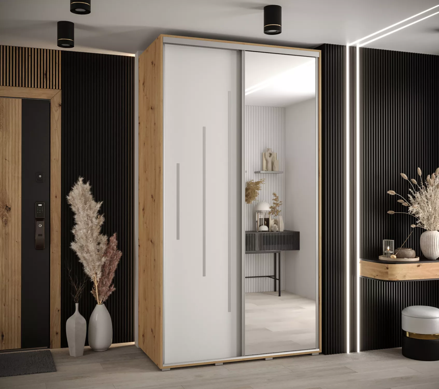 Šatní skříň YVONA 13 - 140/60 cm, dub artisan / bílá / stříbrná